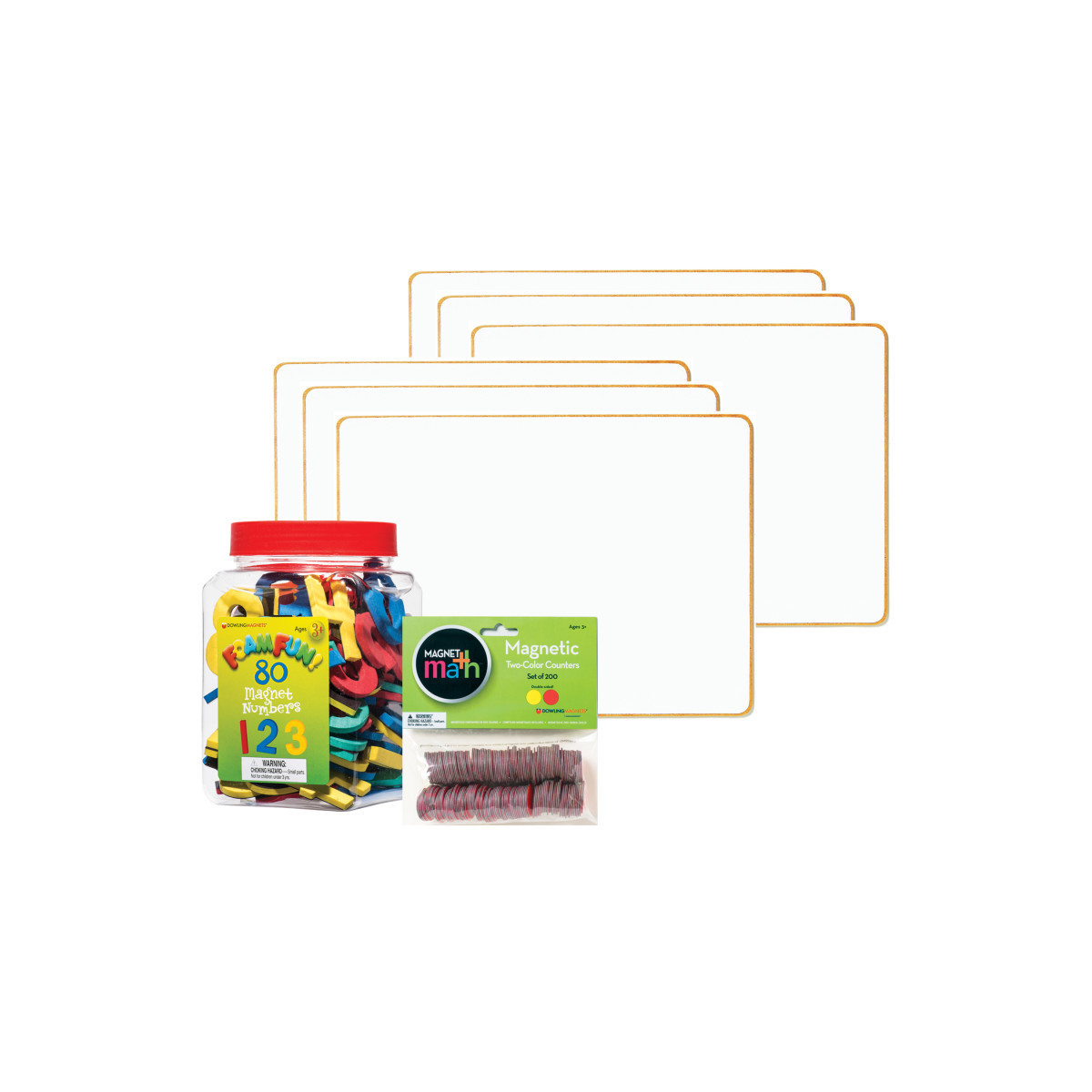 The Magnetic Numbers & Counting Math Centers Bundle is a comprehensive kit designed to enhance mathematical learning and exploration in classrooms and homes alike. This bundle features a pack of 6 Double-sided Magnetic Dry-Erase Blank Boards, providing twice the workspace for students to engage in a variety of counting and number activities. The slim size and impressive durability of these boards make them ideal for student use, whether in classroom centers, at home, or during travel. Paired with the Foam Fun Number Magnets, backed with flexible magnet material for a strong hold on any magnetic surface, children can explore numbers and operational signs in a hands-on and interactive way. With 62 numbers and 18 operational signs included in the set, along with a colorful booklet full of engaging activities, this set provides endless opportunities for math learning. Additionally, the Magnetic Two-Color Counters offer versatility in teaching counting, cardinality, operations, and base-ten concepts, with their double-sided design and red/yellow colors matching counters in popular math programs. With a set of 200 counters included, this bundle is perfect for fostering mathematical skills and concepts in young learners. The Magnetic Numbers & Counting Math Centers Bundle is the perfect resource for educators and parents looking to support and enhance mathematical learning in young children, making math engaging, interactive, and fun.