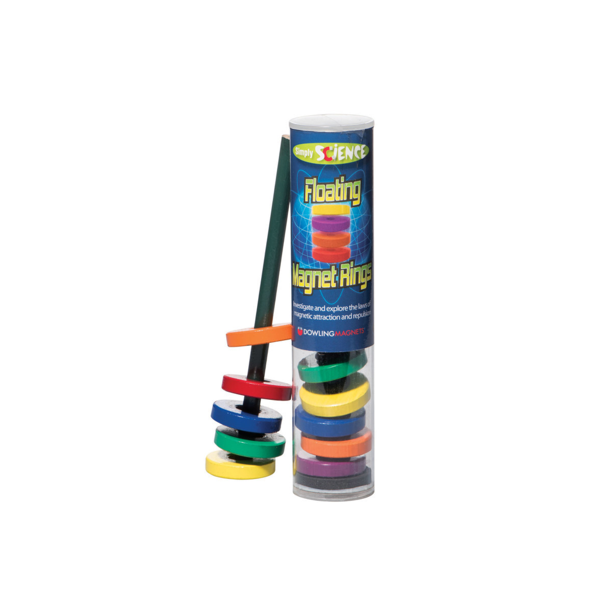 Make these colorful rings magically levitate! Explore and interact with magnetic forces—arrange and rearrange the rings to investigate attraction and repulsion. Includes pencil and 6 ceramic ring magnets. Package measures 6.13"H x 1.5"D. For Ages 8+/Grades 3+.