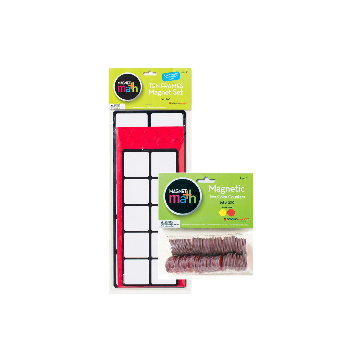 The Ten Frames Magnet Set with Extra Two-Color Counters Bundle includes Ten Frames Magnet Math Set plus an additional set of 200 Magnetic Two-Color Counters. No flimsy frames--each die cut as a solid rectangle! Ten Frames Magnet Math Set features two sizes of magnetic, dry-erasable frames! Large frames help teachers demonstrate base ten and operation concepts on the classroom whiteboard. Smaller frames are for student practice on lap boards. Includes 2 large demo frames, 4 student frames, and 60 magnetic two-color counters (double- sided red/yellow)! Plus, the Ten Frames Magnet Set with Extra Two-Color Counters Bundle includes an extra set of 200 magnetic two-color counters! Great for teaching counting and cardinality, operations, base-ten concepts and more. Features flexible magnet material and red/yellow colors to match counters in the most popular math programs. Counters measure 1" each. Demo frames measure 15"W x 6.19"H.