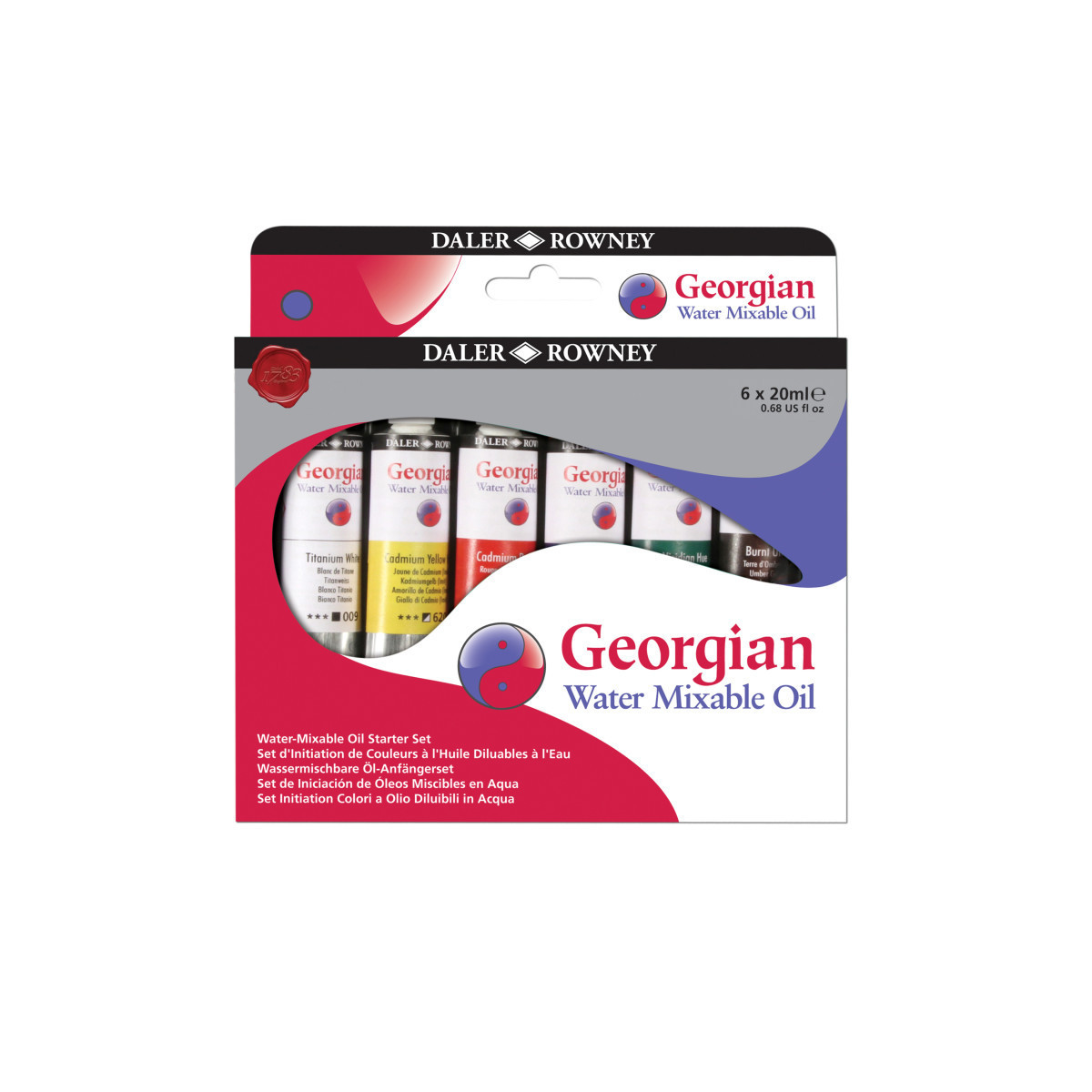 Since 1783, Daler-Rowney has inspired professional artists, art students and hobbyists to embrace their creativity. Georgian Water Mixable Oil colors offer artists the possibility of experiencing oil painting without the need for solvent-based mediums. An alternative to traditional oils, this balanced range of 40 vibrant colors can be thinned, mixed, and washed using water and is ideal for studio use as well as classroom environments. All Georgian Water Mixable Oil colors offer high levels of lightfastness, pigment load, and durability. The viscosity and smooth texture of the colors out of the tube mirror traditional oil colors and can be used for impasto techniques or when thinned down with water they can create wash effects like watercolors. Surface-dry between 5 and 7 days, and no color shift from wet to dry. Each Georgian Water-Mixable Oil Paint Starter Set includes 6 assorted colors, 20ml each.