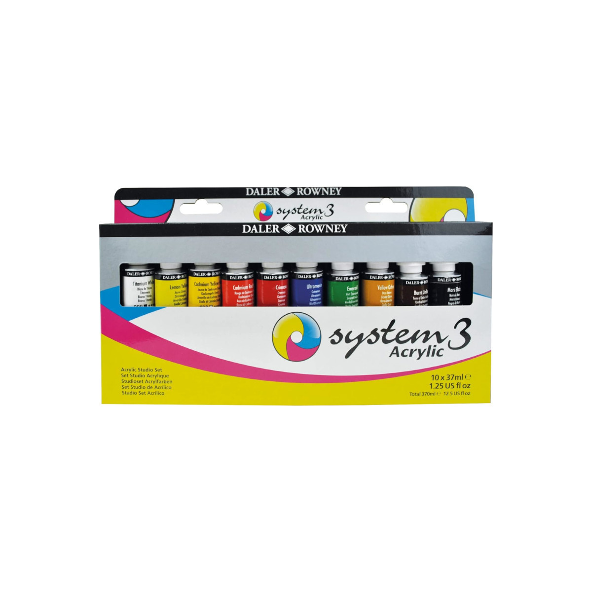 Since 1783, Daler-Rowney has inspired professional artists, art students and hobbyists to embrace their creativity. Daler-Rowney System3 Acrylics are highly versatile water-based acrylic colors. Made from high quality pigments, their superior pigment loading allows for them to be thinned with water to create pale washes or used directly from the tube to form an insoluble film. The fast drying properties of System3 enables artists to work quickly, superimposing or juxtaposing colors with ease. The comprehensive range of colors offers excellent lightfastness, ranking 3 to 4 stars for most colors, permanence, intermixability, durability, and covering power. Suitable for both indoor and outdoor use, System3 Acrylic can be easily applied onto traditional fine art surfaces such as canvas, paper, and board, as well as wood, textile, plastic and murals. Its unique flow formula is ideal for large scale art installations as well as studio projects. Each System3 Acrylic Paint Studio Set includes 10 assorted colors, 37ml each.