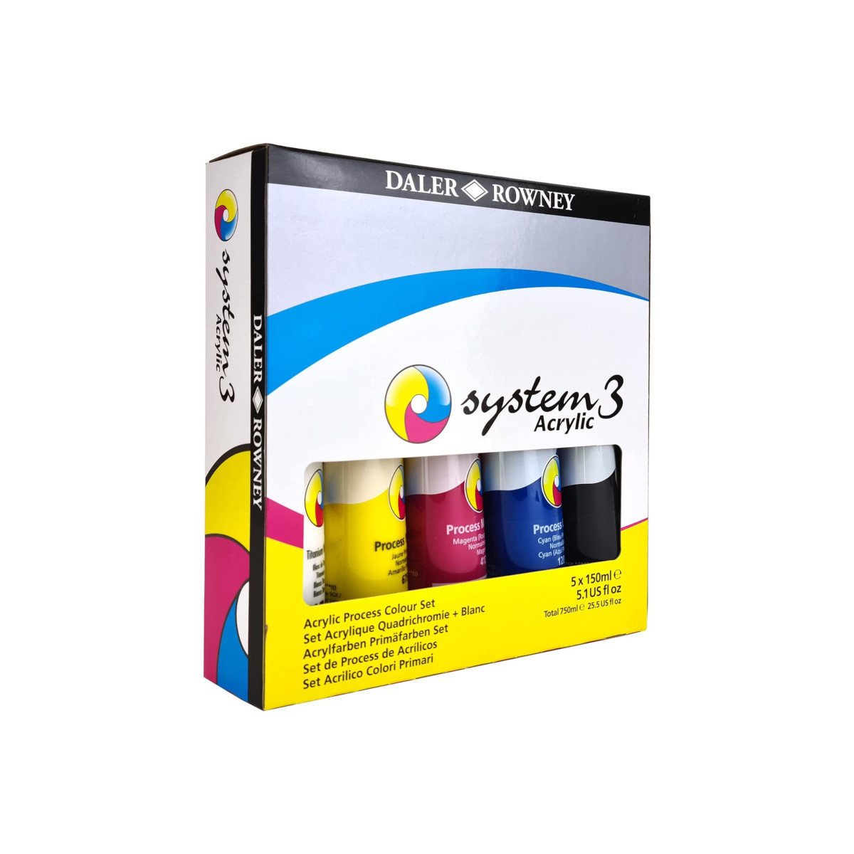 Since 1783, Daler-Rowney has inspired professional artists, art students and hobbyists to embrace their creativity. Daler-Rowney System3 Acrylics are highly versatile water-based acrylic colors. Made from high quality pigments, their superior pigment loading allows for them to be thinned with water to create pale washes or used directly from the tube to form an insoluble film. The fast drying properties of System3 enables artists to work quickly, superimposing or juxtaposing colors with ease. The comprehensive range of colors offers excellent lightfastness, ranking 3 to 4 stars for most colors, permanence, intermixability, durability, and covering power. Suitable for both indoor and outdoor use, System3 Acrylic can be easily applied onto traditional fine art surfaces such as canvas, paper, and board, as well as wood, textile, plastic and murals. Its unique flow formula is ideal for large scale art installations as well as studio projects. Each set includes (5) 150ml tubes of paint: Titanium White, Process Cyan, Process Yellow, Process Black, and Process Magenta.