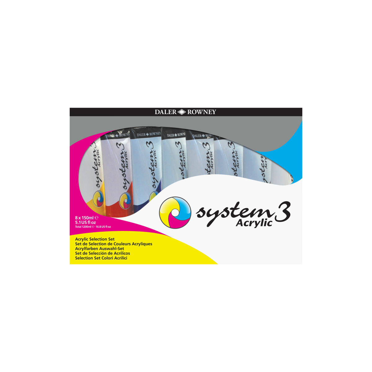 Since 1783, Daler-Rowney has inspired professional artists, art students and hobbyists to embrace their creativity. Daler-Rowney System3 Acrylics are highly versatile water-based acrylic colors. Made from high quality pigments, their superior pigment loading allows for them to be thinned with water to create pale washes or used directly from the tube to form an insoluble film. The fast drying properties of System3 enables artists to work quickly, superimposing or juxtaposing colors with ease. The comprehensive range of colors offers excellent lightfastness, ranking 3 to 4 stars for most colors, permanence, intermixability, durability, and covering power. Suitable for both indoor and outdoor use, System3 Acrylic can be easily applied onto traditional fine art surfaces such as canvas, paper, and board, as well as wood, textile, plastic and murals. Its unique flow formula is ideal for large scale art installations as well as studio projects. Each set includes (8) 150ml tubes of paint: Titanium White, Sap Green, Cadmium Yellow Hue, Yellow Ochre, Cadmium Red Hue, Burnt Umber, Ultramarine, and Mars Black.