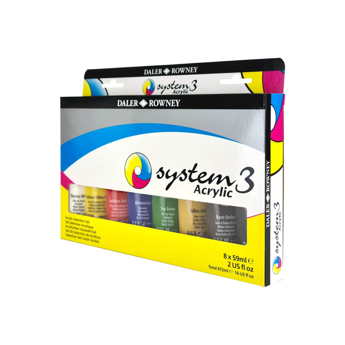 Since 1783, Daler-Rowney has inspired professional artists, art students and hobbyists to embrace their creativity. Daler-Rowney System3 Acrylics are highly versatile water-based acrylic colors. Made from high quality pigments, their superior pigment loading allows for them to be thinned with water to create pale washes or used directly from the tube to form an insoluble film. The fast drying properties of System3 enables artists to work quickly, superimposing or juxtaposing colors with ease. The comprehensive range of colors offers excellent lightfastness, ranking 3 to 4 stars for most colors, permanence, intermixability, durability, and covering power. Suitable for both indoor and outdoor use, System3 Acrylic can be easily applied onto traditional fine art surfaces such as canvas, paper, and board, as well as wood, textile, plastic and murals. Its unique flow formula is ideal for large scale art installations as well as studio projects. Each set includes (8) 59ml tubes of paint: Titanium White, Sap Green, Cadmium Yellow Hue, Yellow Ochre, Cadmium Red Hue, Burnt Umber, Ultramarine, and Mars Black.