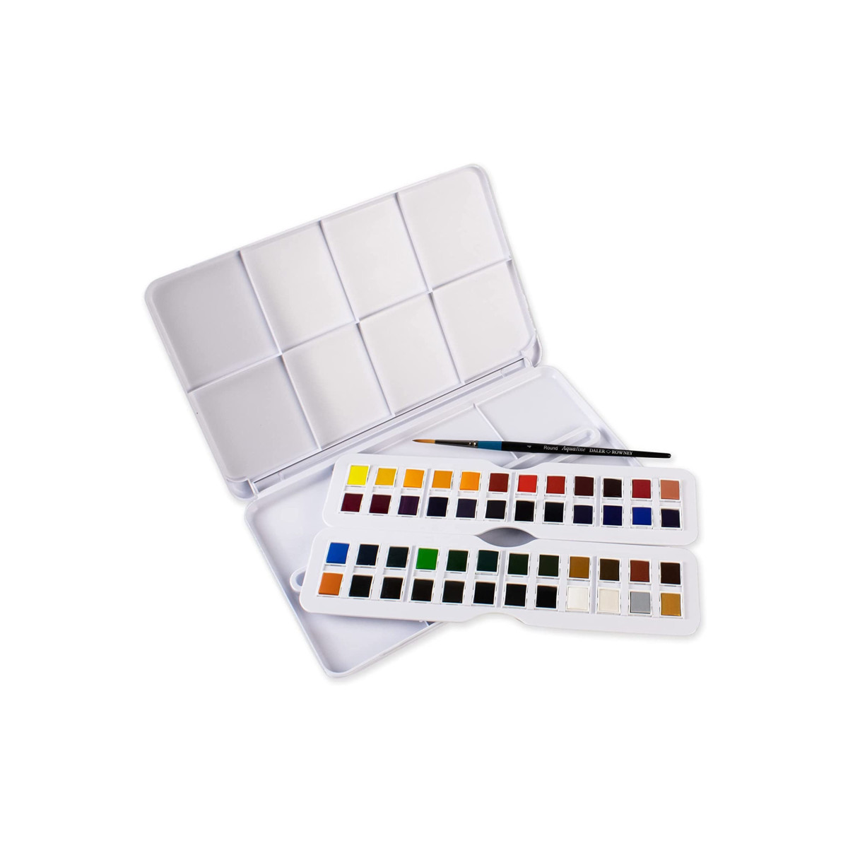 Since 1783, Daler-Rowney has inspired professional artists, art students and hobbyists to embrace their creativity. We believe in producing art supplies that are sustainable, qualitative, durable, accessible and affordable. Aquafine watercolor paint makes creating watercolor art easier than ever. Whether you're a professional artist, a beginner working on your techniques, or somewhere in between, this Aquafine set will help you express your creative vision. Milled to perfection in every batch, Aquafine watercolor paints are free-flowing and vibrant. Each color is crafted from high-quality organic pigments with no fillers resulting in rich, transparent color. The milling process produces a smooth paint formula that offers optimal performance, magnificent control and a superior painting experience. Unrivaled in their category, these colors flow effortlessly over watercolor paper, canvases, and other suitable mediums. Simply wet the paint with water to activate it and begin your creative journey. The paint has excellent lightfastness for archival quality, so when you’re finished creating your works will last, remaining vivid and beautiful for years to come. If you're looking for affordable professional-grade watercolor paints in a wide variety of shades, look no further. Aquafine watercolors make quality and performance more accessible than ever. Half Pan Travel Set includes 48 colors and a brush in a cover.