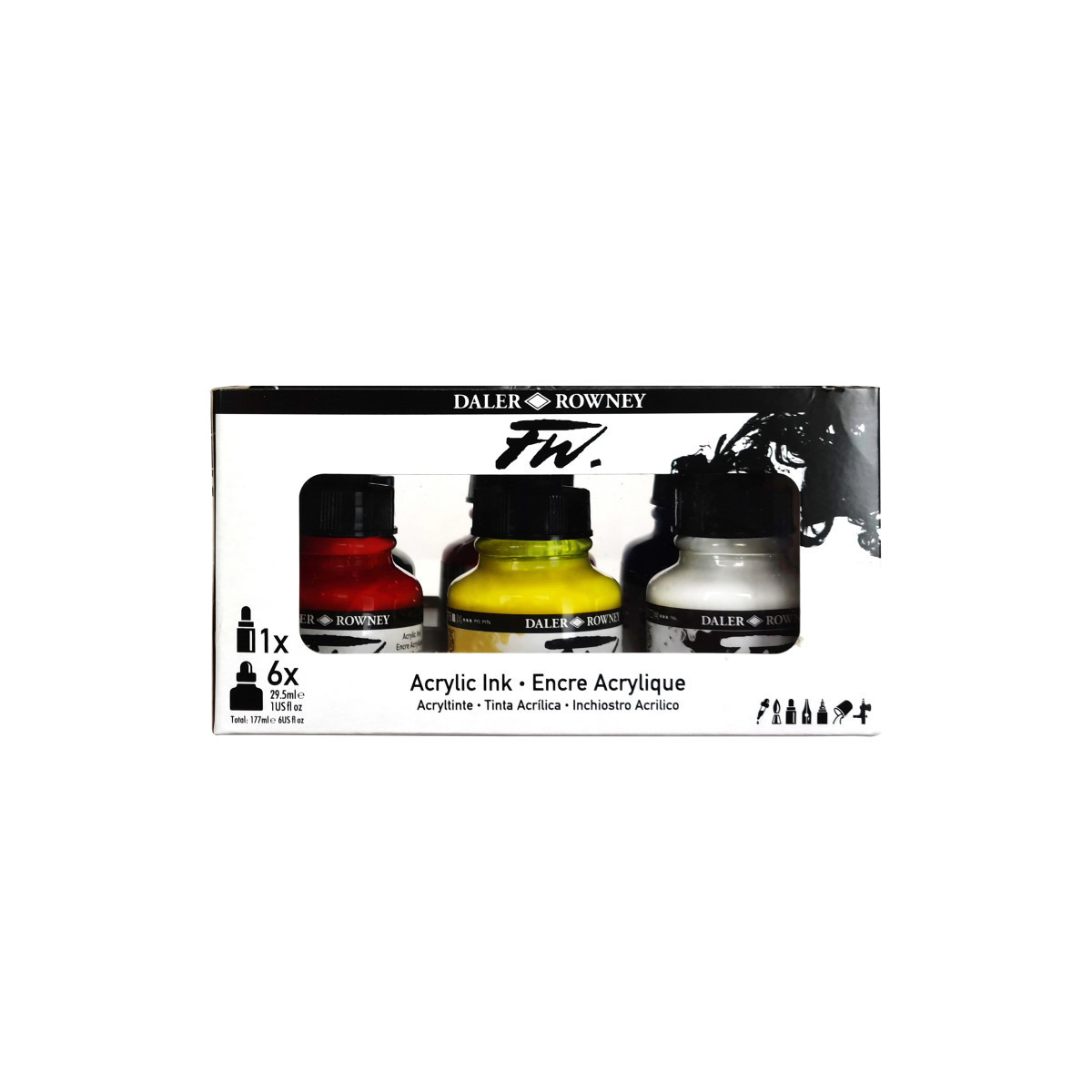 Since 1783, Daler-Rowney has inspired professional artists, art students and hobbyists to embrace their creativity. Whether you're a professional artist, a beginner working on your techniques, or somewhere in between, this acrylic ink is available in 29.5ml and 180ml bottles, and 45 striking colors to help you express your creative vision. Made with superior pigments, this FW ink set contains incredibly lightfast, richly hued ink with marvelous fluidity and is a great alternative to alcohol or india inks. All ink colors in this artist set are fully intermixable and can be used directly from the bottle or thinned with water to create amazing effects. Explore the exciting world of art ink pouring with the added acrylic pouring medium which is suitable for techniques such as dirty pour, swirl, puddle pour, flip cup, and swipe. Ideal for fine artists, illustrators, graphic designers, calligraphers, decorative artists and hobbyists, these inks make a great addition to calligraphy kits, any drawing set, airbrush kits, or can be used as watercolor liquid and more. If you're looking for an affordable professional-grade ink set in a wide variety of colors, look no further. Daler Rowney acrylic ink makes quality and performance more accessible than ever. Each set includes an empty marker and (6) 29.5ml bottles of Acrylic Ink: White, Black, Process Yellow, Process Cyan, Crimson, Process and Magenta.