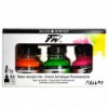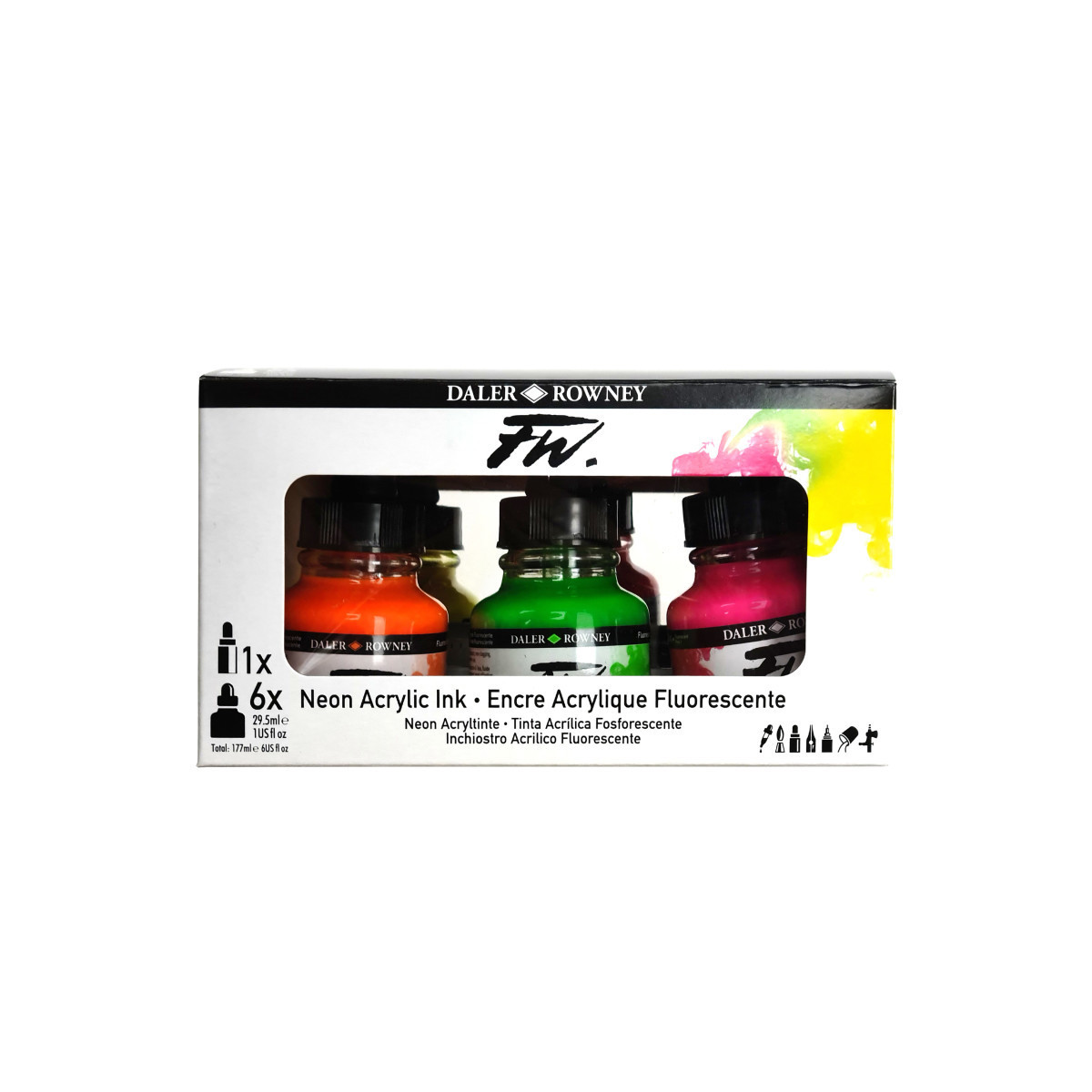 Since 1783, Daler-Rowney has inspired professional artists, art students and hobbyists to embrace their creativity. Whether you're a professional artist, a beginner working on your techniques, or somewhere in between, this acrylic ink is available in 29.5ml and 180ml bottles, and 45 striking colors to help you express your creative vision. Made with superior pigments, this FW ink set contains incredibly lightfast, richly hued ink with marvelous fluidity and is a great alternative to alcohol or india inks. All ink colors in this artist set are fully intermixable and can be used directly from the bottle or thinned with water to create amazing effects. Explore the exciting world of art ink pouring with the added acrylic pouring medium which is suitable for techniques such as dirty pour, swirl, puddle pour, flip cup, and swipe. Ideal for fine artists, illustrators, graphic designers, calligraphers, decorative artists and hobbyists, these inks make a great addition to calligraphy kits, any drawing set, airbrush kits, or can be used as watercolor liquid and more. If you're looking for an affordable professional-grade ink set in a wide variety of colors, look no further. Daler Rowney acrylic ink makes quality and performance more accessible than ever. Each set includes an empty marker and (6) 29.5ml bottles of Acrylic Ink: Fluorescent Yellow, Fluorescent Green, Fluorescent Orange, Fluorescent Blue, Fluorescent Red, and Fluorescent Pink.