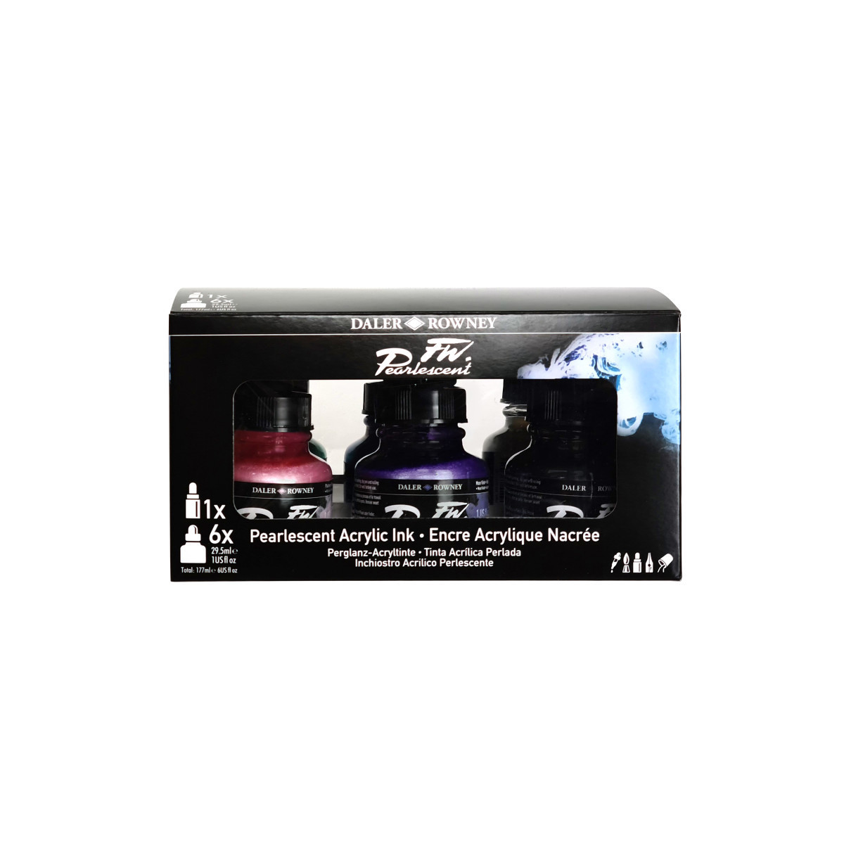 Since 1783, Daler-Rowney has inspired professional artists, art students and hobbyists to embrace their creativity. Whether you're a professional artist, a beginner working on your techniques, or somewhere in between, this acrylic ink is available in 29.5ml and 180ml bottles, and 45 striking colors to help you express your creative vision. Made with superior pigments, this FW ink set contains incredibly lightfast, richly hued ink with marvelous fluidity and is a great alternative to alcohol or india inks. All ink colors in this artist set are fully intermixable and can be used directly from the bottle or thinned with water to create amazing effects. Explore the exciting world of art ink pouring with the added acrylic pouring medium which is suitable for techniques such as dirty pour, swirl, puddle pour, flip cup, and swipe. Ideal for fine artists, illustrators, graphic designers, calligraphers, decorative artists and hobbyists, these inks make a great addition to calligraphy kits, any drawing set, airbrush kits, or can be used as watercolor liquid and more. If you're looking for an affordable professional-grade ink set in a wide variety of colors, look no further. Daler Rowney acrylic ink makes quality and performance more accessible than ever. Each set includes an empty marker and (6) 29.5ml bottles of Acrylic Ink: White Pearl, Black, Platinum Pink, Waterfall Green, Moon Violet, and Galactic Blue.