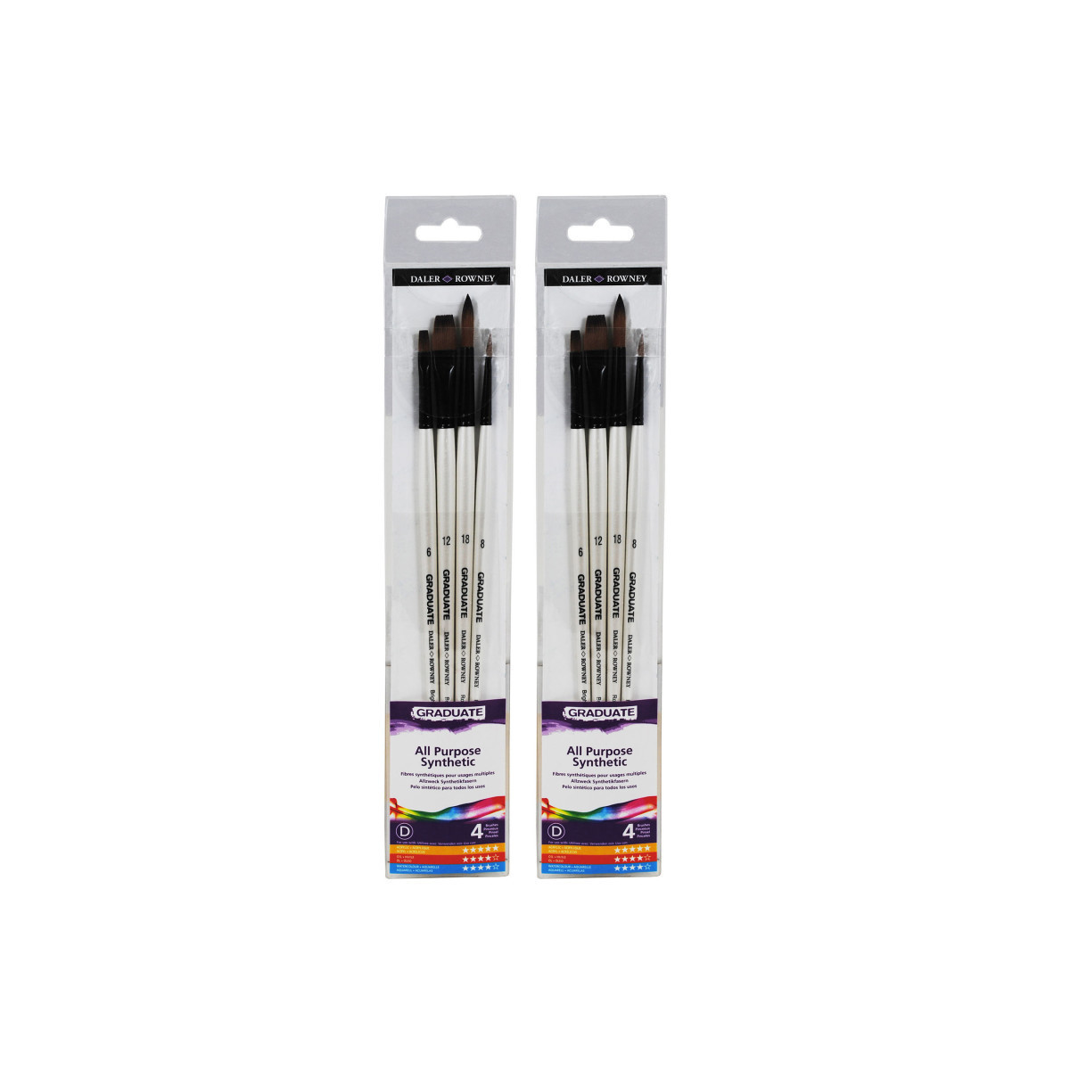 Daler-Rowney Graduate paintbrushes are an amazing choice for students & beginners, offering top-notch quality without breaking the bank. Made with durable synthetic bristles, these brushes hold their shape & give you precise control for smooth, even strokes. Plus, with a wide variety of brush types, you can easily explore different techniques & styles, making every painting session a creative adventure. Since 1783, Daler-Rowney has inspired professional artists, art students & hobbyists to embrace their creativity. We believe in producing art supplies that are sustainable, qualitative, durable, accessible & affordable. The Graduate product line is a premier collaboration between three renowned art supply brands—Canson, Lyra, and Daler-Rowney—offering a comprehensive range of high-quality art materials. Featuring an array of supplies including sketchbooks, pencils, and paints, each product is designed to enhance technical skill and artistic expression. Ideal for art students and teachers alike, the Graduate range provides the tools necessary for fostering creativity in the classroom. Each set includes long handle brushes Flat Size 6, Flat Size 12, Round Size 8, Round Size 18. Sold as 2 sets for a total of 8 brushes.