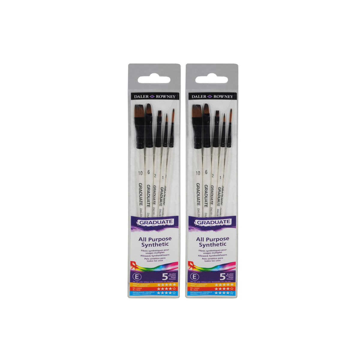 Daler-Rowney Graduate paintbrushes are an amazing choice for students & beginners, offering top-notch quality without breaking the bank. Made with durable synthetic bristles, these brushes hold their shape & give you precise control for smooth, even strokes. Plus, with a wide variety of brush types, you can easily explore different techniques & styles, making every painting session a creative adventure. Since 1783, Daler-Rowney has inspired professional artists, art students & hobbyists to embrace their creativity. We believe in producing art supplies that are sustainable, qualitative, durable, accessible & affordable. The Graduate product line is a premier collaboration between three renowned art supply brands—Canson, Lyra, and Daler-Rowney—offering a comprehensive range of high-quality art materials. Featuring an array of supplies including sketchbooks, pencils, and paints, each product is designed to enhance technical skill and artistic expression. Ideal for art students and teachers alike, the Graduate range provides the tools necessary for fostering creativity in the classroom. Each set includes short handle brushes Flat (Size 2 & 10), Script Liner (Size 1), Round (Size 1), Oval (Size 6). Sold as 2 sets for a total of 10 brushes.