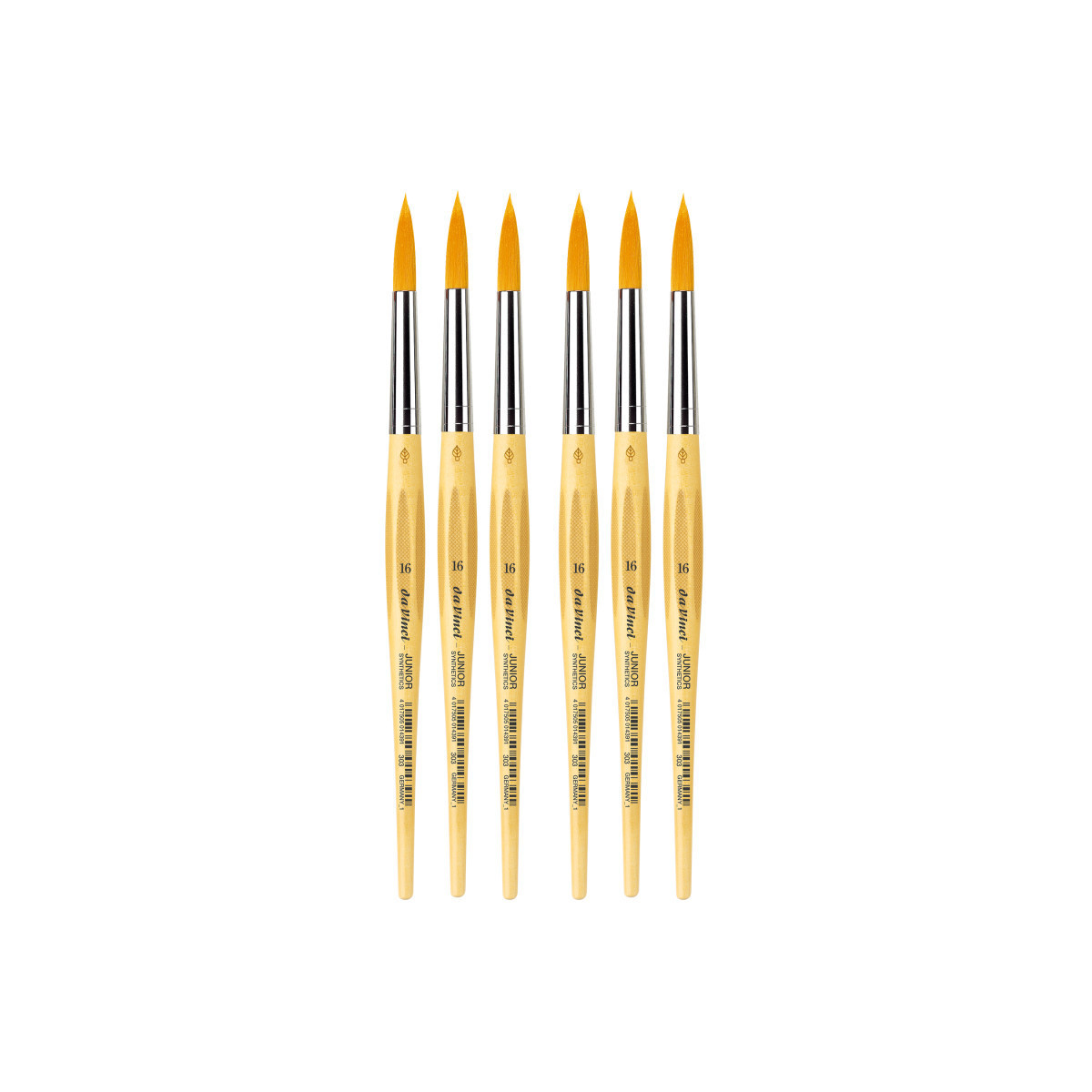 da Vinci Junior art brushes are a well built, easy to use brush developed to improve the quality of brushes for beginners. They can be used with any type of paint and are easy to clean. The "hold it like a pencil" handle shape makes for a comfortable and familiar grip. The brush won't roll away if dropped. It has a reinforced brush head for heavy wear that will always hold its edge. Unlike most cheaper brushes, da Vinci junior features a "rust resistant" seamless polished ferrule. Made in Germany. Sustainable wood handles. Vegan. Eco-Friendly. Sold as a pack of 6.