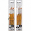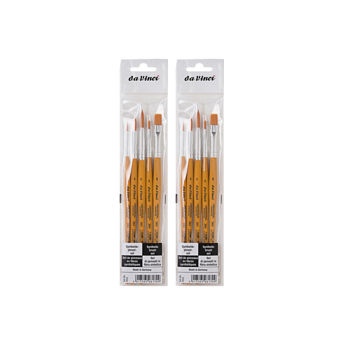 Universal synthetic brushes are suitable for all craft techniques and liquid colors. These brushes feature highly polished aluminum ferrules that resist rust and long orange matte handles. Certified eco-friendly, green manufacturing with sustainable wood handles made in Germany. Each set includes 5 brushes: Series 383 (Round) Size 2, 4 and 8 as well as Series 384 (Flat) Size 4 and 8. Sold as 2 sets for a total of 10 brushes.
