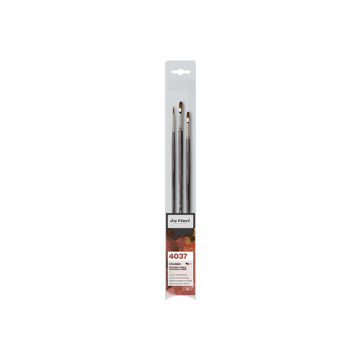 For many years, the brush industry has invested in researching all options to imitate the special properties of Siberian Kolinsky Red Sable hair with synthetic fibers. A most difficult task due to the particular structure of this precious natural material, which has become very rare and expensive over the last few years. With COLINEO we have succeeded in creating a mixture of synthetic fibers, very similar to its natural ideal. A carefully balanced mixture of different lengths of straight and wavy synthetic fibers with extra fine tips and tapered points, high elasticity and color absorption. Made in Germany. 100% Vegan. Handles are from sustainable forests in the Baltic states. Eco friendly manufacturing. This set includes: Series 1621 Size 2, Series 1821 Size 4 and Series 1825 Size 8.