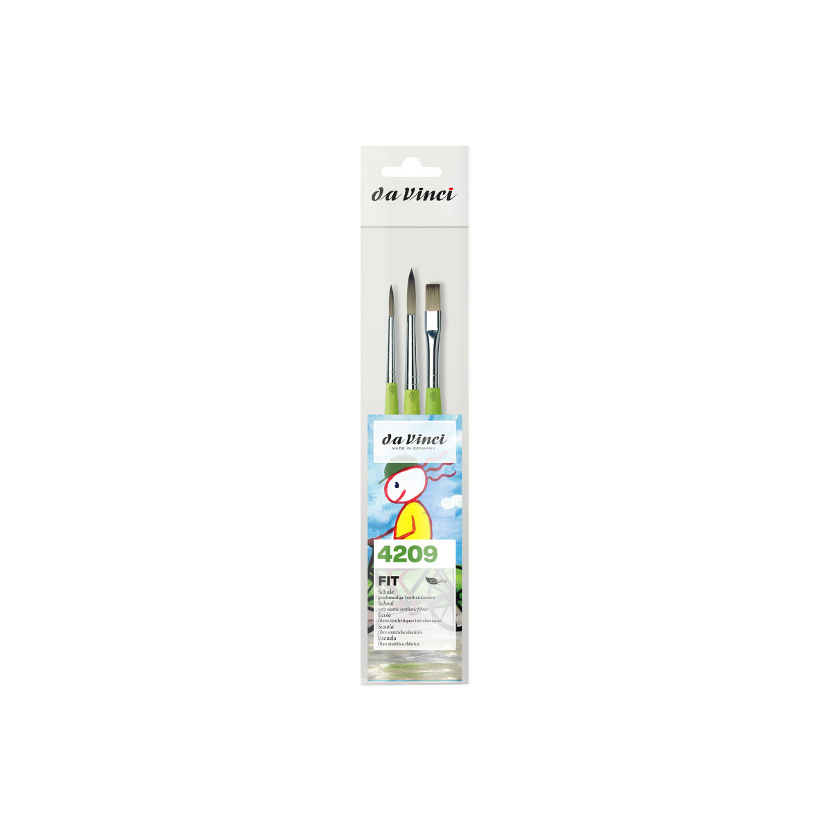 Thanks to a specifically developed, flexible, grey synthetic fiber we have created a hobby and school painting brush, which fascinates not only by its interesting look but also by its attractive price. This innovative product offers better performance than the traditional school brush with natural hair when it comes to stroke control and color absorbing capacity. The brush features a green, matte handle with seamless, rust-proof aluminum ferrules. Made in Germany. 100% Vegan. This set contains: Series 373 Size 4 and 8 as well as Series 374 Size 8.