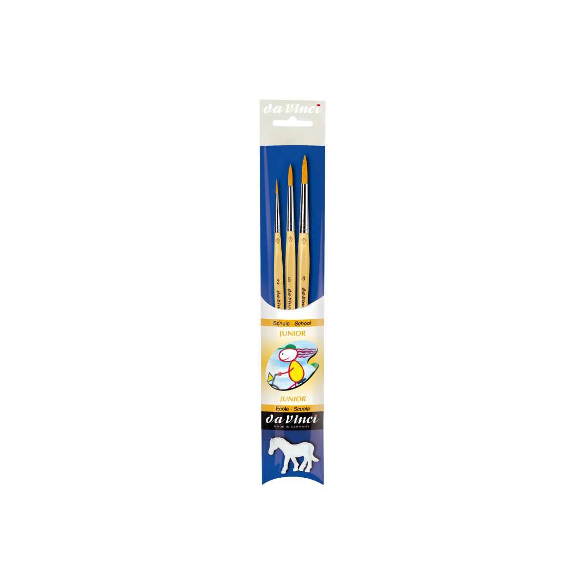 da Vinci Junior art brushes are a well built, easy to use brush developed to improve the quality of brushes for beginners. They can be used with any type of paint and are easy to clean. The "hold it like a pencil" handle shape makes for a comfortable and familiar grip. The brush won't roll away if dropped. It has a reinforced brush head for heavy wear that will always hold its edge. Unlike most cheaper brushes, da Vinci junior features a "rust resistant" seamless polished ferrule. Made in Germany. Sustainable wood handles. Vegan. Eco-Friendly. This set contains: Series 303 Size 2, 5 and 8.