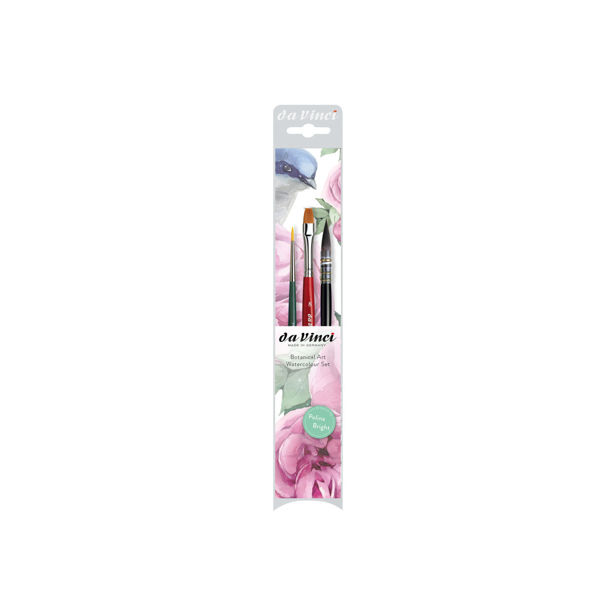This 3-brush set contains Series 498 CASANEO Size 2, Series 5570 NOVA Size 2 and Series 5880 COSMOTOP-SPIN Size 8. These 3 brushes work together to make the ultimate watercolor set for Botanicals. Manufactured from extra smooth, slightly wavy synthetic fibers, CASANEO replicates the feel of natural squirrel hair but comes to a better point. COSMOTOP-SPIN holds more water than any other synthetic with a blend of 5 different diameters of extra smooth fiber ensuring the highest color-absorption of any synthetic brush. NOVA golden synthetic brush has a well-known mix of synthetic fibers of 3 different diameters with a high color absorbing capacity for smooth and even strokes. Handles are made of wood that is harvested from sustainable forests.