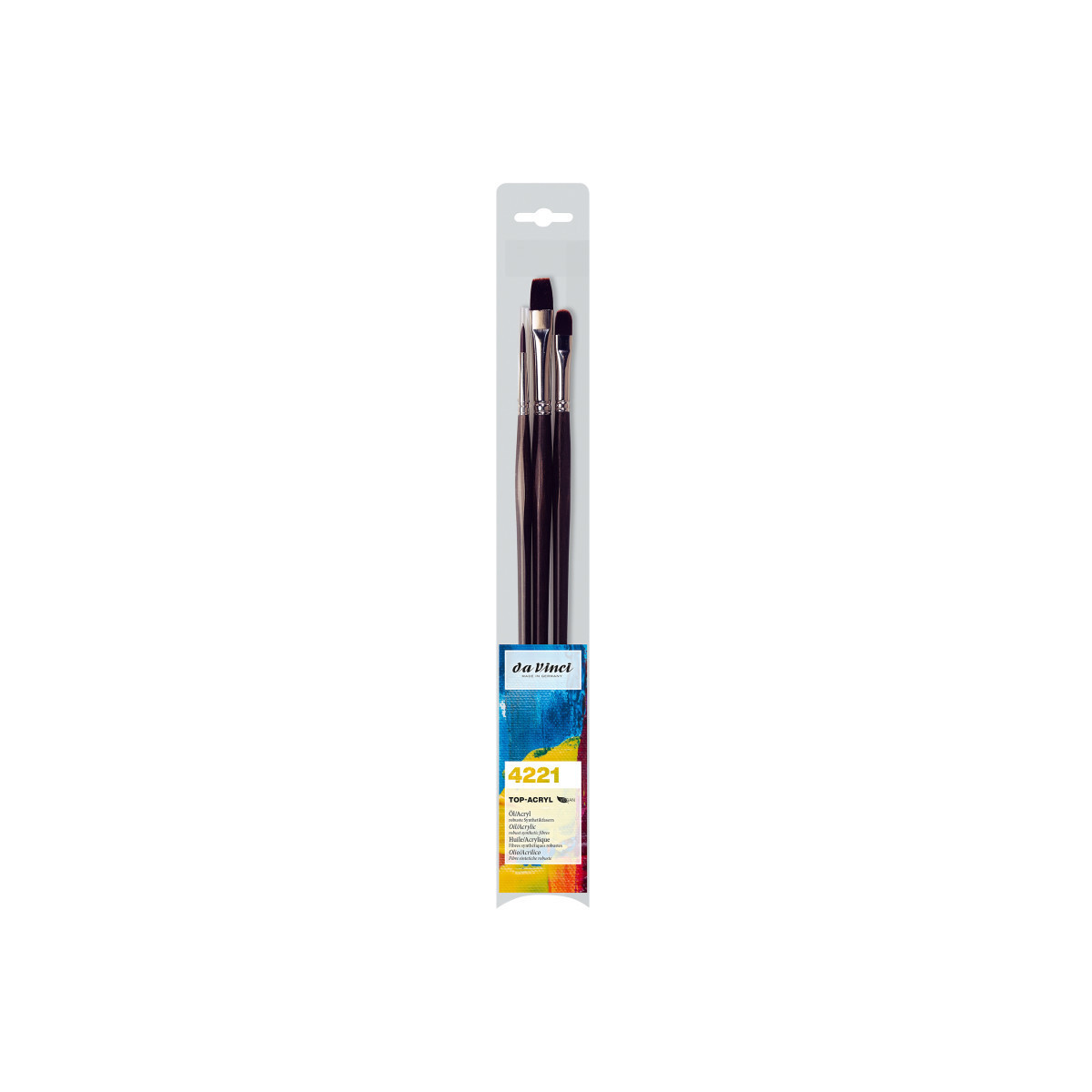 Extra strong and stiff for acrylics, oils & water-mixable oils TOP-ACRYL is constructed with 5 different diameters of extra strong Synthetic Bristle. Long handles fit right in your painting box or travel easel. Exclusive design developed by da Vinci. Extra stiff with a precise snap, and a favorite of Impasto painters (who use thick applications of paint). Whether massing color in the larger sizes or precision painting in the smaller sizes, TOP-ACRYL brushes offer the artist versatility and ruggedness. The brush features a long, lacquered hexagonal handle. This set includes: Series 7185 Size 12, Series 7485 Size 8 and Series 7785 Size 4.