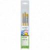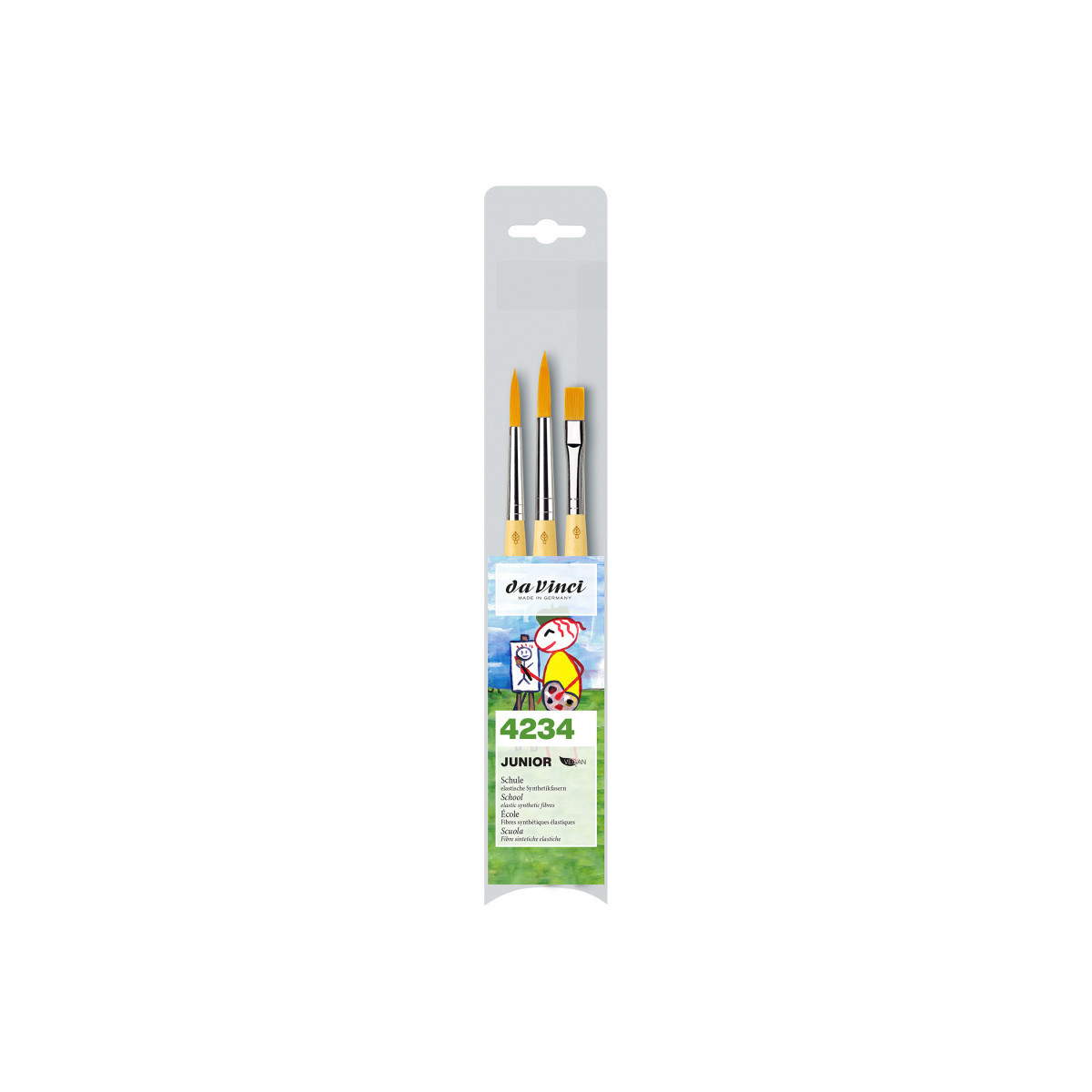 da Vinci Junior art brushes are a well built, easy to use brush developed to improve the quality of brushes for beginners. They can be used with any type of paint and are easy to clean. The "hold it like a pencil" handle shape makes for a comfortable and familiar grip. The brush won't roll away if dropped. It has a reinforced brush head for heavy wear that will always hold its edge. Unlike most cheaper brushes, da Vinci junior features a "rust resistant" seamless polished ferrule. Made in Germany. Sustainable wood handles. Vegan. Eco-Friendly. This set contains: Series 303 Size 8 and 12 as well as Series 304 Size 8.