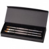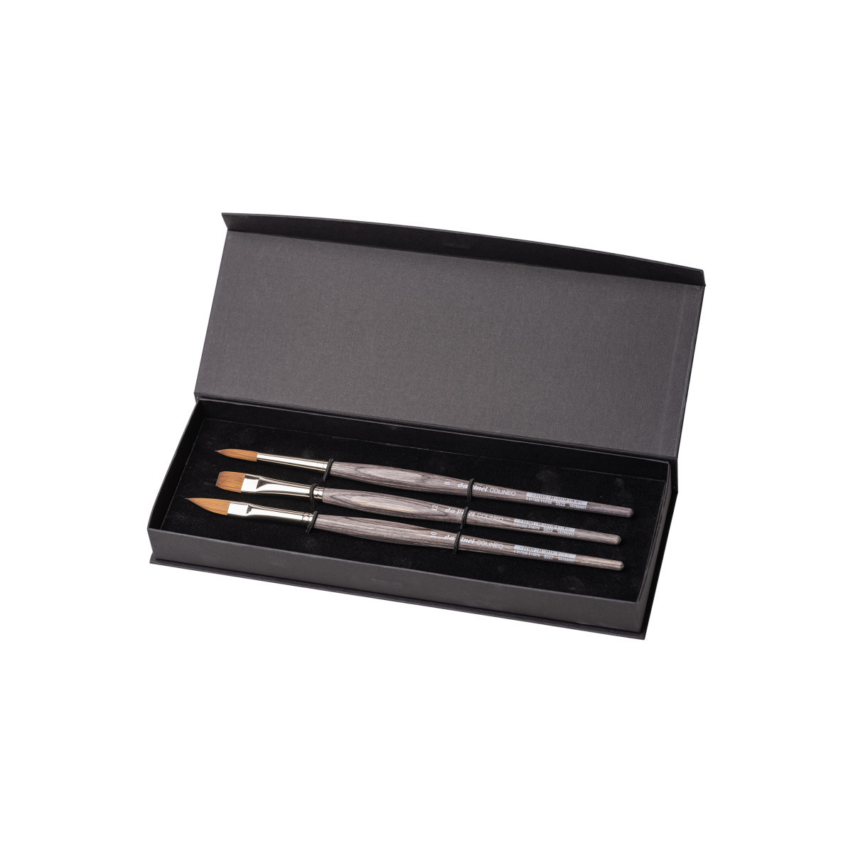 For many years, the brush industry has invested in researching all options to imitate the special properties of Siberian Kolinsky Red Sable hair with synthetic fibers. A most difficult task due to the particular structure of this precious natural material, which has become very rare and expensive over the last few years. With COLINEO we have succeeded in creating a mixture of synthetic fibers, very similar to its natural ideal. A carefully balanced mixture of different lengths of straight and wavy synthetic fibers with extra fine tips and tapered points, high elasticity and color absorption. Made in Germany. 100% Vegan. Handles are from sustainable forests in the Baltic states. Eco friendly manufacturing. This set includes: Series 5522 Size 8, Series 5527 Size 10 and Series 5822 Size 12.