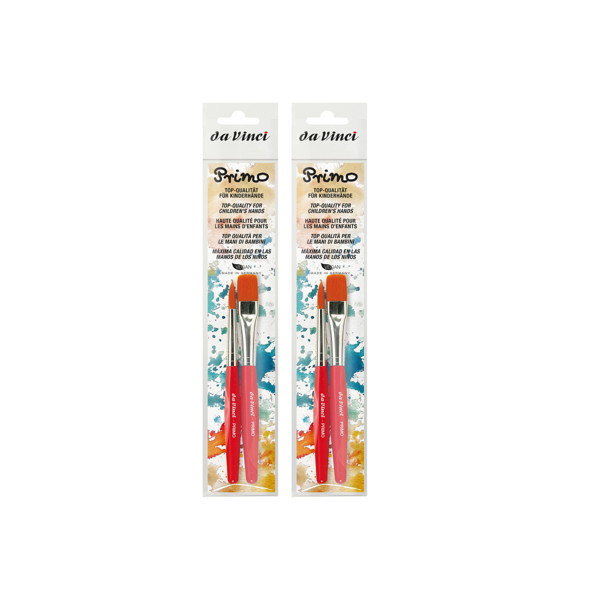 da Vinci Primo is designed for children learning to paint. The handles are sized and shaped to be easy to hold and have a strong brush head to provide a long-lasting brush. This durable brush is great for any type of paint, especially covering colors, tempera and watercolor. Hexagonal, Water-based lacquered handle for a better grip that won’t roll away makes this brush a favorite amongst young artists, teachers, kids and art therapists. The high-quality aluminum ferrule is rust-resistant. Certified eco-friendly, green manufacturing with sustainable wood handles made in Germany. Each set includes 2 brushes: Series 353R Size 12 and Series 354R Size 12. Sold as 2 sets for a total of 4 brushes.