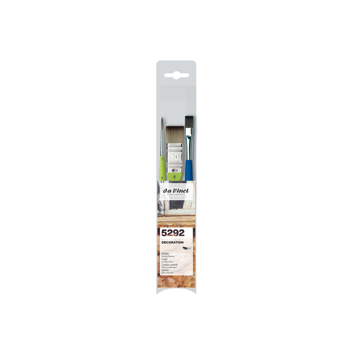 Thanks to a specifically developed, flexible synthetic fiber we have created a hobby and school painting brush assortment, which fascinates not only by its interesting look but also by its attractive price. This innovative product offers better performance than the traditional school brush with natural hair when it comes to stroke control and color absorbing capacity. The durable, synthetic fibers are great for a variety of surfaces. The brushes feature a green or blue, matte handle with seamless, rust-proof aluminum ferrules. Made in Germany. 100% Vegan. This set contains: Series 373 Size 4, Series 394 Size 10 and Series 5073 Size 20.