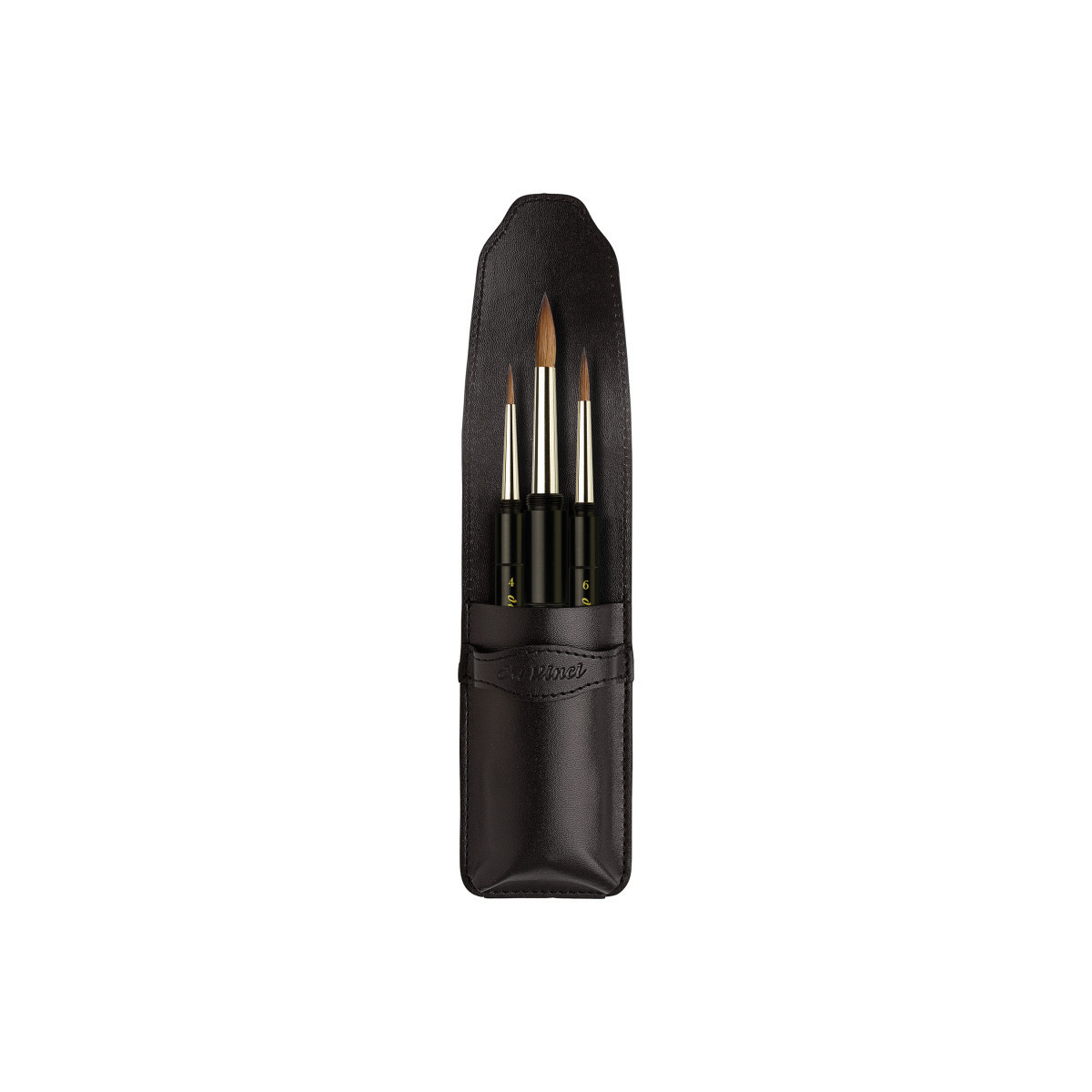 The MAESTRO designation denotes the highest quality winter male Kolinsky Red Sable hair from the Tobol River region in Eastern Siberia. The high-quality, extra-elastic Kolinsky Red Sable brushes provide high color absorption, making it easy to paint all details perfectly. This set contains 3 travel brushes in an imitation-leather case. Put in your pocket, your handbag, watercolor set or easel and you are ready to go. The hard casing around the brush is virtually indestructible. These brushes are excellent for watercolors, illustration, animation and rendering. Certified green manufacturing with sustainable wood handles made in Germany at our family-owned factory since 1890. This set includes Series 1503 Size 4, 6 and 10.