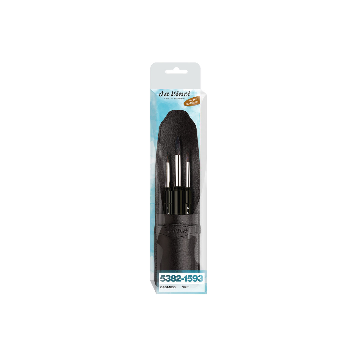 Our tried and tested pocket/travel brushes in an attractive, robust artificial leather case. CASANEO is a new "wavy" fiber synthetic developed by da Vinci for water media artists. Manufactured from extra smooth, slightly wavy synthetic fibers, CASANEO replicates the feel of natural squirrel hair but comes to a better point. This special construction allows the fibers to absorb a huge amount of water & color delivering an endless brush stroke. The brush is 100% vegan and is a favorite for watercolor, gouache, urban sketching, illustration, painting with inks or dyes and fluid acrylics. The brush has a flawless design as it screws together protecting the brush head for safe travels. It also has a drying hole so the brush will dry. Fits easily in a pocket or any painting set. Certified green manufacturing made in Germany. This set includes 3 brushes: Series 1593 Size 4, 6 and 10.