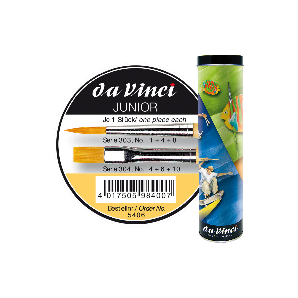 da Vinci Junior art brushes are a well built, easy to use brush developed to improve the quality of brushes for beginners. They can be used with any type of paint and are easy to clean. The "hold it like a pencil" handle shape makes for a comfortable and familiar grip. The brush won't roll away if dropped. It has a reinforced brush head for heavy wear that will always hold its edge. Unlike most cheaper brushes, da Vinci junior features a "rust resistant" seamless polished ferrule. Made in Germany. Sustainable wood handles. Vegan. Eco-Friendly. This set contains: Series 303 Size 1, 4 and 8 as well as Series 304 Size 4, 6 and 10.