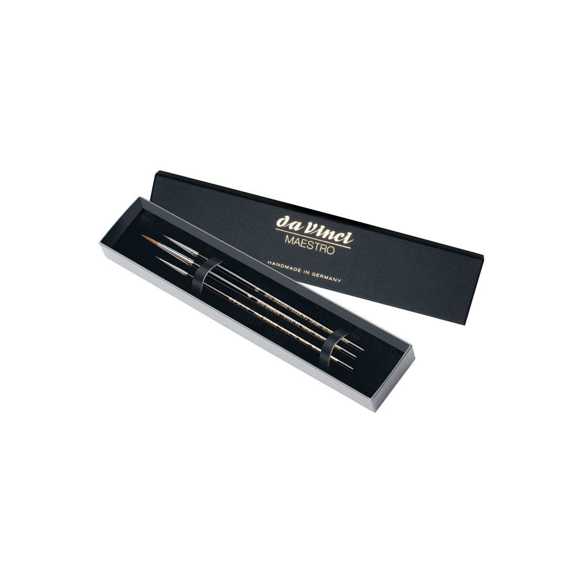 This 3-brush set is the perfect gift for watercolorists. Series 10 has European style shaping with an extra-sharp point and the fastest action at the tip. The high-quality, extra-elastic Kolinsky Red Sable brushes provide high color absorption, making it easy to paint all details perfectly. All brushes are handmade from raw material to finished brush by skilled artisans at the factory. Hair is deeply set in in brass ferrule so brush will keep its shape. The nickel-plated brass ferrule is rust-resistant. Certified green manufacturing with sustainable wood handles made in Germany at our family-owned factory since 1890. This set includes Series 10 (Round) in Size -5, 0 and 4 in an elegant black gift box.