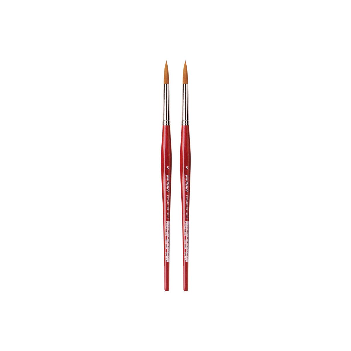 COSMOTOP-SPIN synthetics are great for watercolor, gouache, acrylic & ink. Spin holds more water than any other synthetic with a blend of 5 different diameters of extra smooth fiber ensuring the highest color-absorption of any synthetic brush. It has a sturdy construction and will retain its shape. Beautiful lacquered red handles and nickel-plated brass ferrules are rust proof. Hexagonal handles prevent the brush from rolling away. Certified green manufacturing with sustainable wood handles. Handmade in Germany at our family-owned factory since 1890. Sold as a pack of 2.