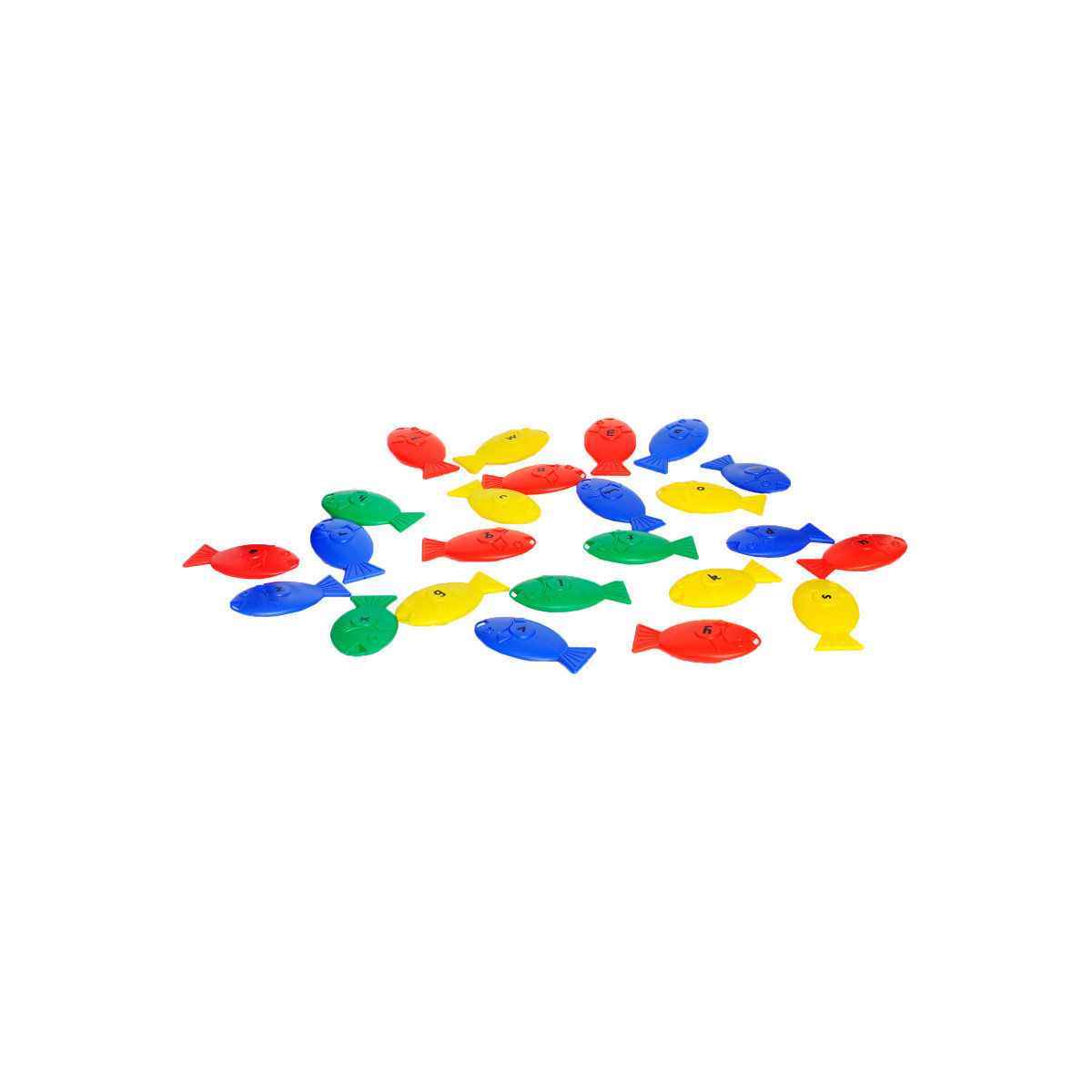 This set contains 26 brightly colored, lettered fish and 2 plastic fishing rods together with a net bag for storage.