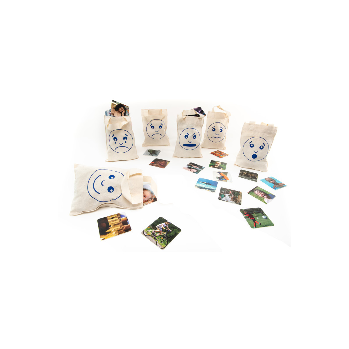 - The 6 natural cotton bags each show a different emotion (Happy, Sad, Surprised, Worried, Angry and Upset).