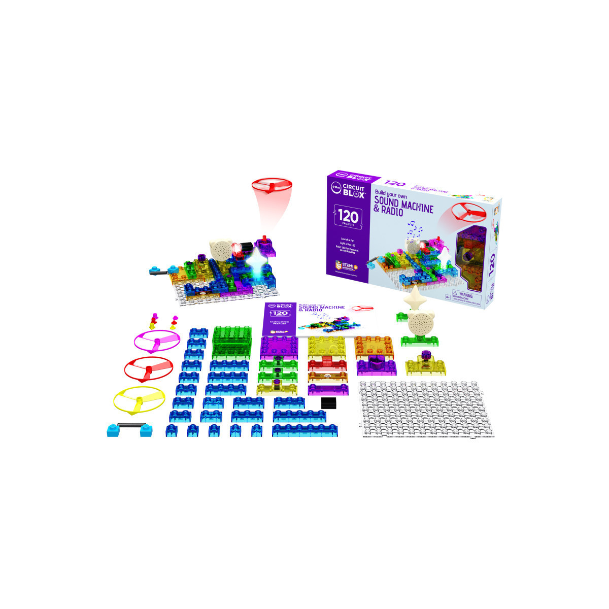 This kit provides hours of fun and educational play. The colorful building blocks contain electronic components such as a battery module, switches, LEDs, motor, speaker, IC sound module, amplifier or FM receiver. Build 120 different 3D circuits that teach STEM and light a star, spin a motor to launch a fan high in the air, play music, sirens and space battle sounds, and even build your own FM radio!