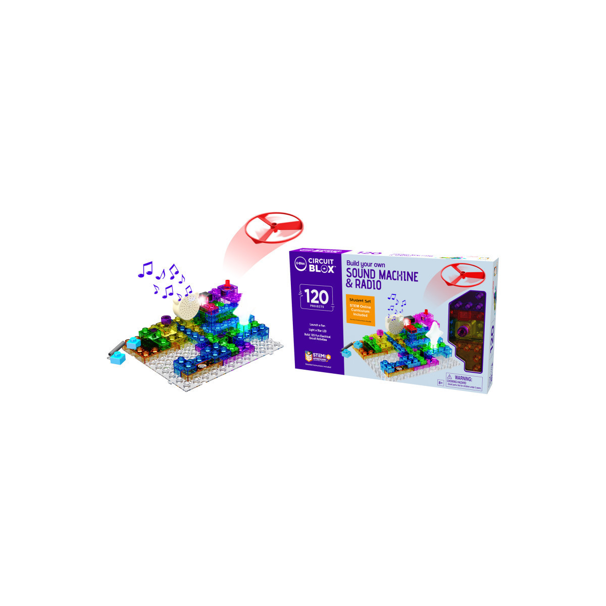 This kit provides an electronic brick based construction set with curriculum to teach STEM. The colorful building blocks contain electronic components such as a battery module, switches, LEDs, motor, speaker, IC sound module, amplifier or FM receiver. Build 120 different 3D circuits that teach STEM and light a star, spin a motor to launch a fan high in the air, play music, sirens and space battle sounds, and even build your own FM radio! Curriculum includes a 79 page online teacher guide with 7 lessons of animated curriculum, quizzes and quiz answer sheets that address Next Generation Science Standards (NGSS) requirements.