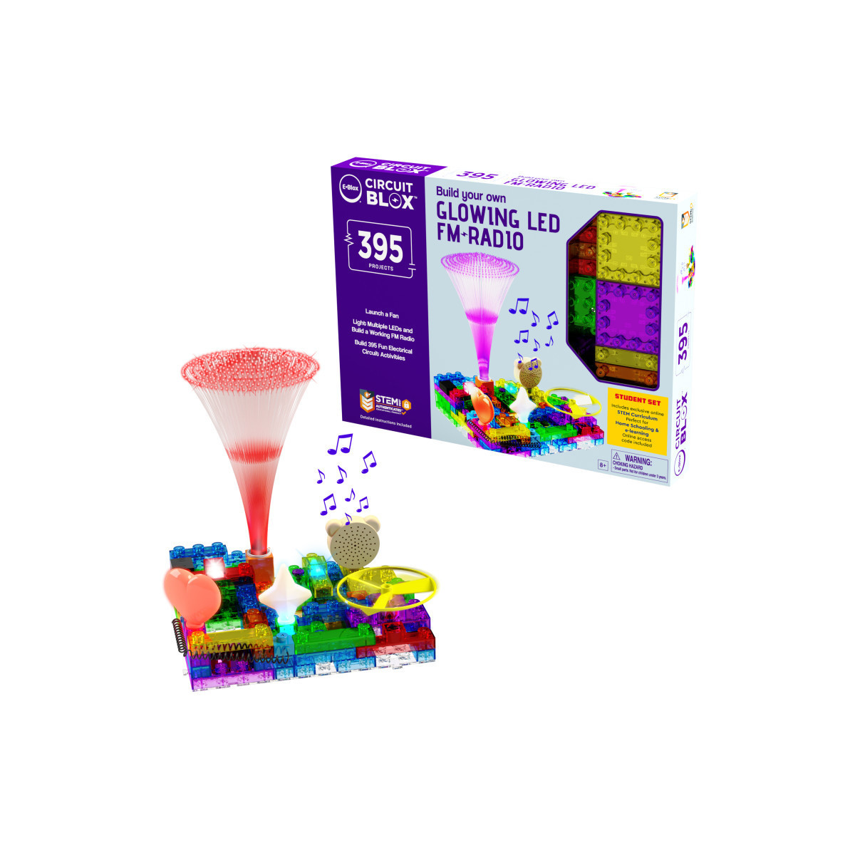 The Circuit Blox™ 395 Student Set includes a teacher guide with curriculum lessons, quizzes, and an answer sheet. The student building block sets have different lessons that cover various STEM concepts. Designed for grades 4 through 6. Student will be entertained for hours while learning! Learn all about electricity, current and voltage. Discover how lights, alarms, motors, switches, resistors, capacitors, transistors and more work all while building fun projects. Build a real working FM radio and listen to your favorite station. Great addition to any STEM program. Compatible with other building brick sets.