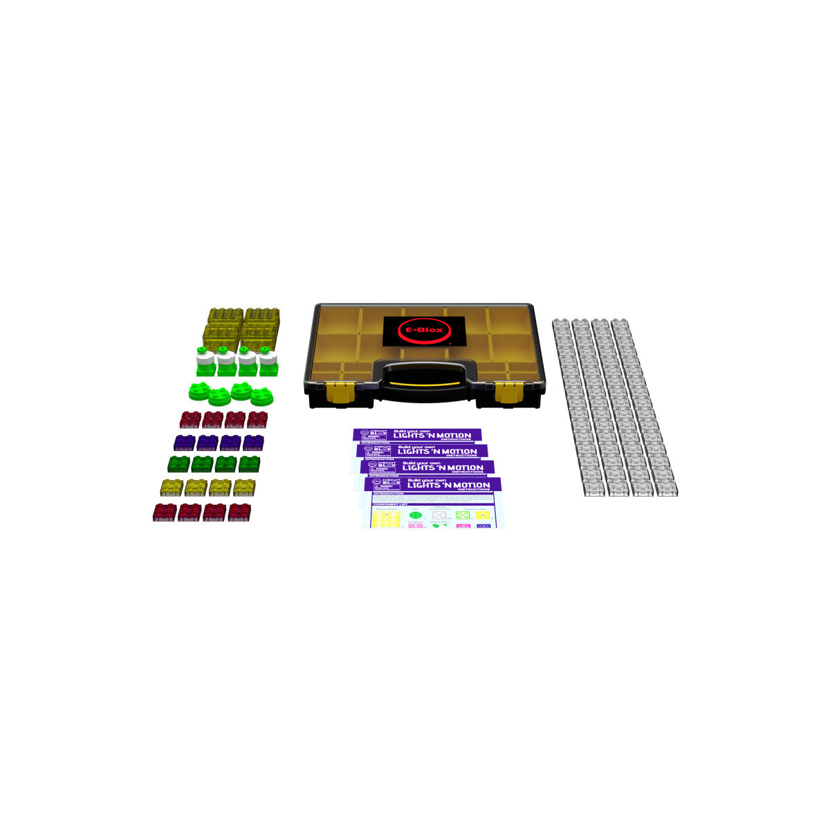This set contains four CB-0286 Circuit Blox Lights 'N Motion sets, all packed into a sturdy storage case for sharing in the classroom. The colorful building blocks contain electronic components such as a battery module, a geared motor module, a gear module and LED modules. Includes online animated curriculum only available with E-Blox Student Sets. Lessons cover Building Fundamentals, Electricity & Circuits, Motors, Gears & Light.