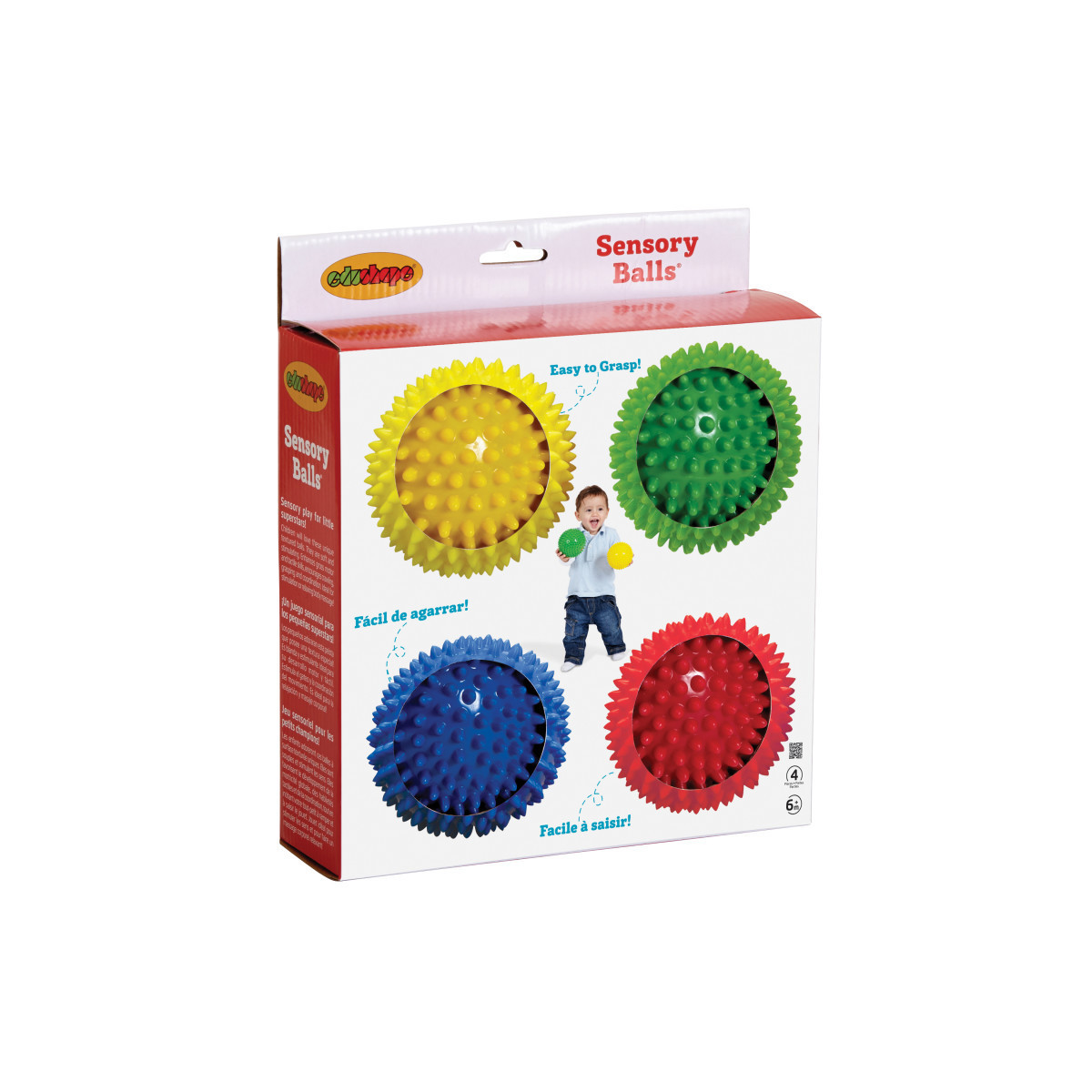 Infants can squeeze, roll, throw or kick these colorful and textured balls. Their bumpy surface offers a tremendous sensory play value for the young athletes. Set includes 4 primary color balls, 1 each of yellow, blue, green and red. The colorful nubby balls are great for fun and therapy. Measures 4" (10 cm) D.