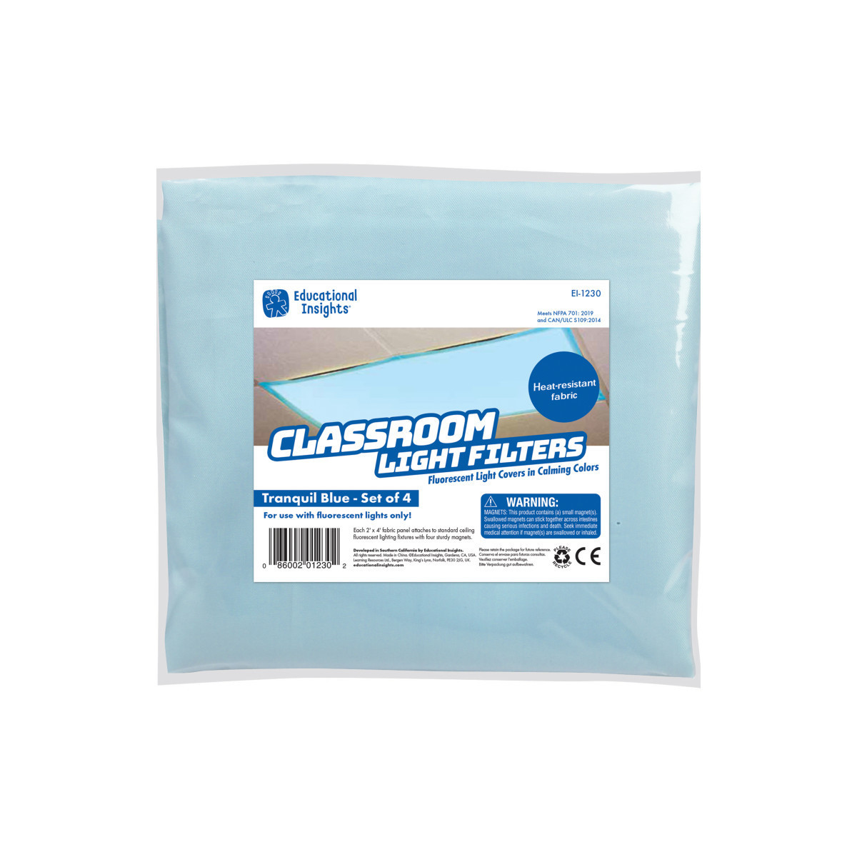 Fluorescent lights are a staple in classrooms, but their harsh glare and flickering light can cause eyestrain, headaches, and anxiety in students. Cover your classroom fluorescent lights with these fabric panels that fit over standard ceiling fixtures with sturdy, sewn-in magnets. Each set includes four 2' x 4' heat-resistant panels in Tranquil Blue. For use with fluorescent lights only!