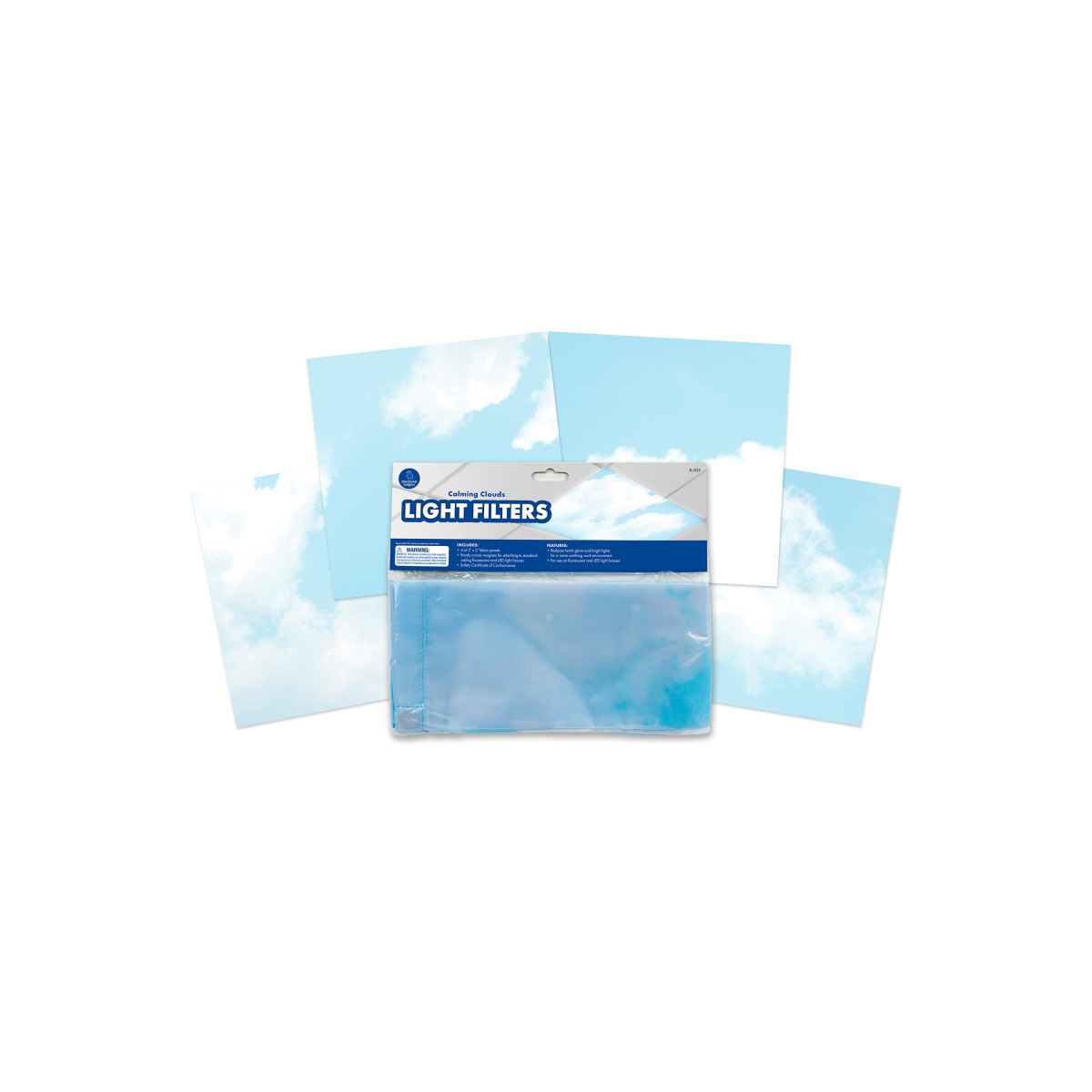 Fluorescent and LED lights are staples in many classrooms and offices, but their harsh glare and flickering light can cause eyestrain, headaches, and anxiety. Cover your lights with these fabric panels and create a calm and soothing environment perfect for focusing and concentrating! Calming Clouds Light Filters attach easily over standard ceiling fixtures with six sturdy, sewn-in magnets. Each set includes four 2' x 4' heat-resistant panels with four different cloud patterns in soothing shades of blue and soft white. For use with fluorescent and LED lights only.