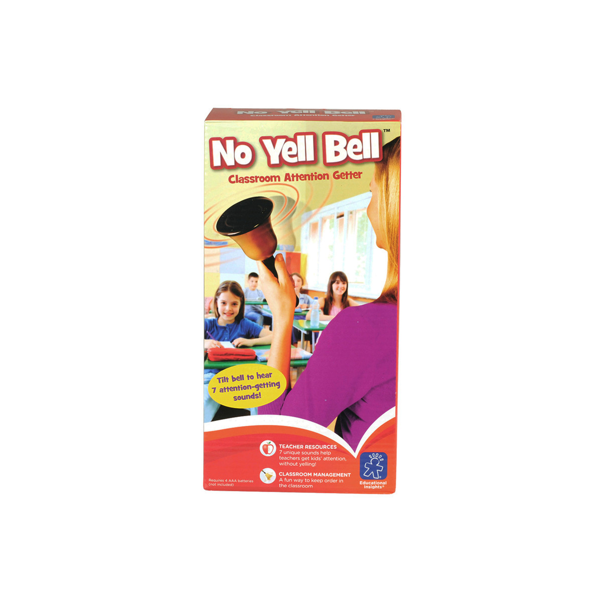 No need to shout when you have this versatile, voice-saving electronic teacher bell! Simply dial one of seven unique sounds, tilt the bell, and point it at your students. The crystal-clear sound begins immediately - and gets everyone's attention! Use the No Yell Bell to signal the beginning or end of an activity, to warn children that they're too noisy, or to applaud a job well done. High-quality speaker and volume control allow you to use the bell indoors or out. Sounds include bugle call, applause, tick-tock alarm, hand bell, alarm clock ring, and more.Requires 4 AAA batteries (not included).