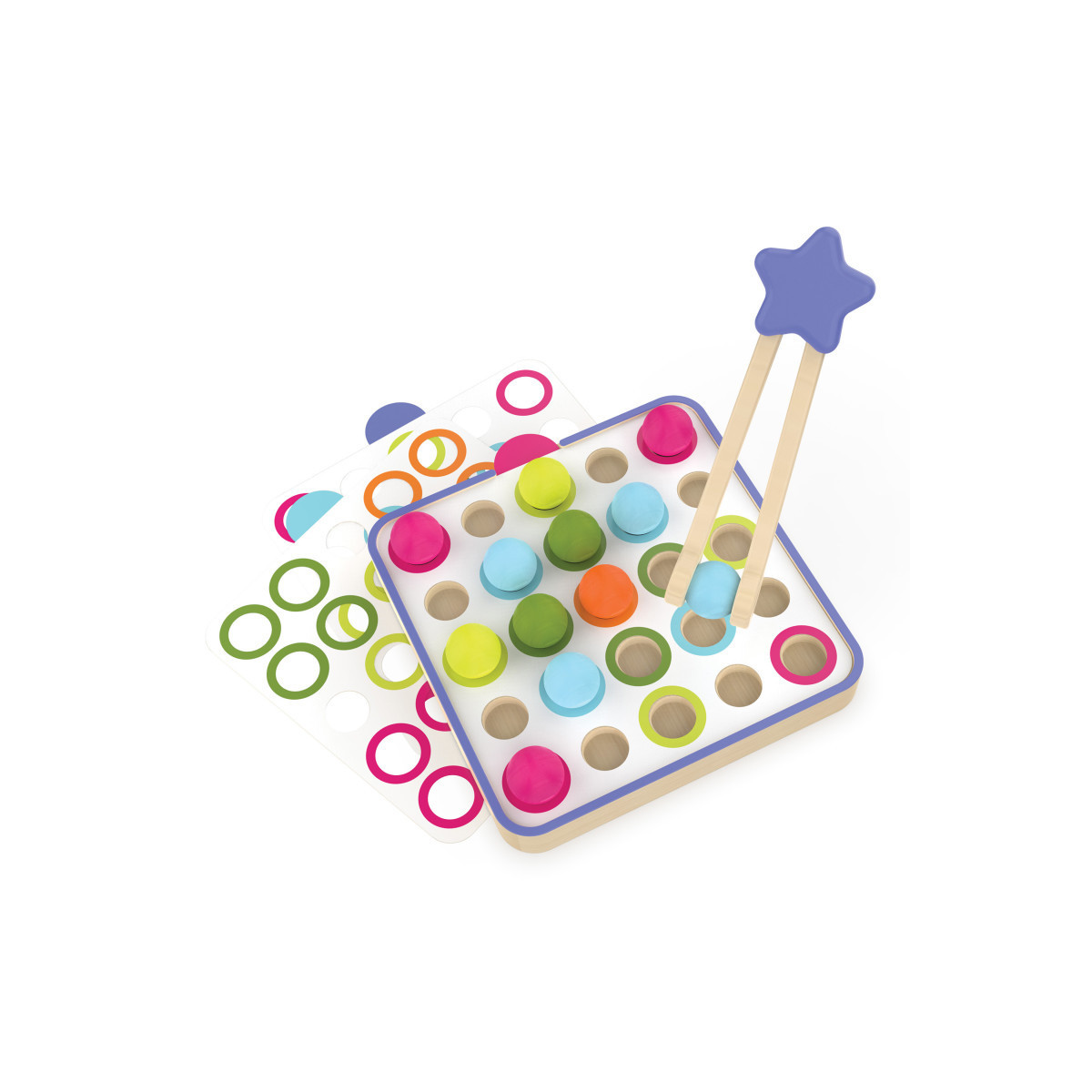 - Includes wooden frame board, five double-sided pattern cards, 25 wooden spheres, Easy Tweezies wooden squeezers, and activity guide.