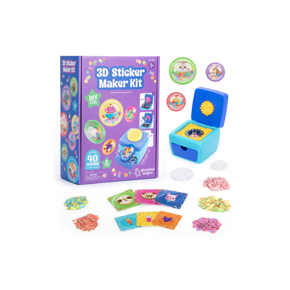 - Includes Sticker Maker with interchangeable sticker holders, 20 small sticker shells, 20 large sticker shells, 20 small backers, 20 large backers, and 6 confetti fillers.