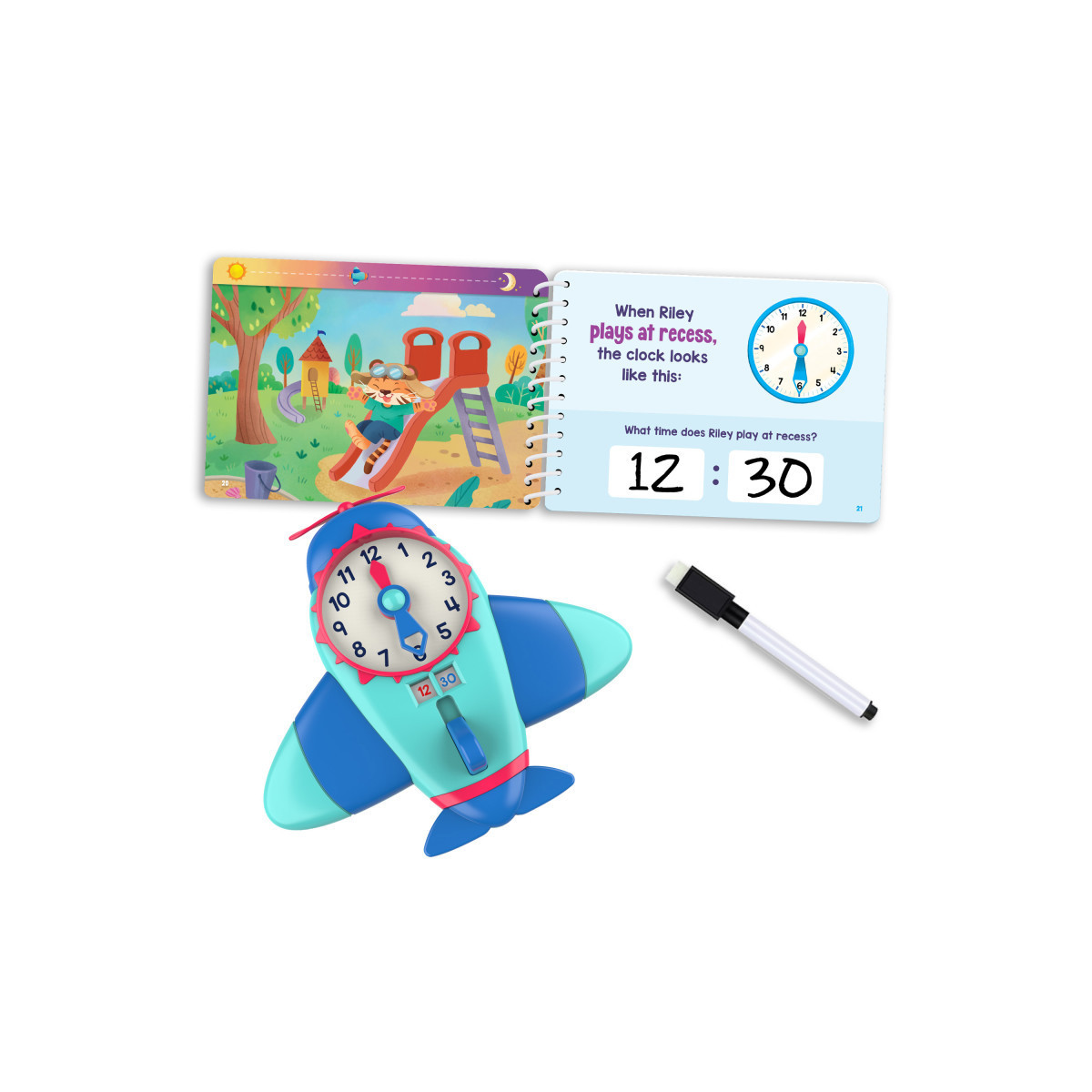 Learn to tell and read time with this hands-on activity set all about kids' daily routines. Read the prompt in the activity book, which features realistic daily events like snack time and math centers, then use the plane clock to set the analog time. Pull down on the tail fin to check your answer with the color-coded digital time. Then use the dry-erase marker to fill in the activity book with the right time. This set helps kids learn to tell and read both digital and analog clocks, improve number recognition, and get familiar with their daily school routines. Includes plane clock with check-your-answer feature, 48-page dry-erase activity booklet, and dry-erase marker. For ages 3+.