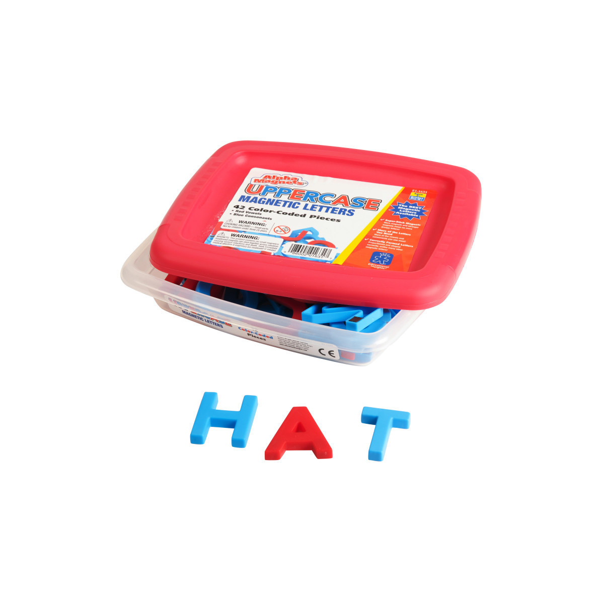 AlphaMagnets are shaped accurately with correct proportions, and are made with strong magnets for a 'sure stick.' Alphabet assortments come with more of the letters you need most (extra vowels a, e, i, o, u, and consonants b, l, m, r, s, andt), and include punctuation marks. Color-coded sets help teach differentiation with red vowels and blue consonants (42 pieces, 1.5" tall). Comes in a durable, stackable tub with brightly colored plastic lid for convenient self-storage.