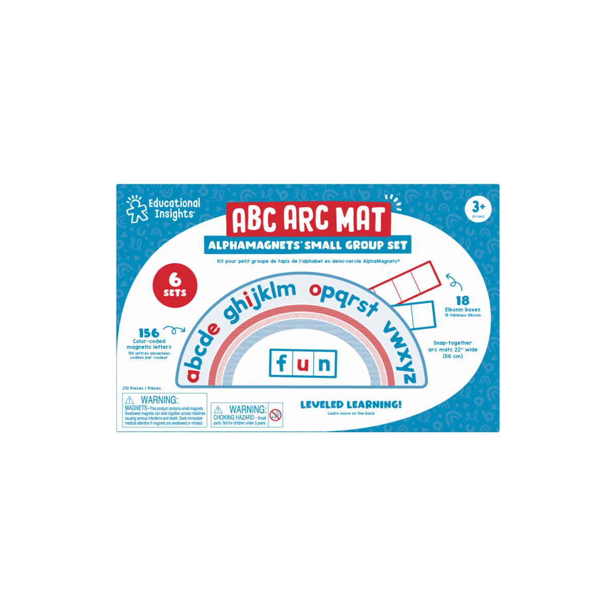 Hands-on reading fun for the whole class! This 6-pack is perfect for small group reading activities, from letter matching to spelling and word-building. Have students work together to spell words or individually in small groups for hands-on, tactile play with AlphaMagnets. The ABC Arc Mat uses alphabet arc strategy, a common teaching tool for preschool and kindergarten readers. Includes six magnetic alphabet arc snap-together mats (22" assembled) with dry-erase boards, six sets of 26 lowercase and color-coded (red vowels, blue consonants) AlphaMagnets®, six magnetic alphabet strips, 18 Elkonin boxes, and teacher guide. For ages 3+.