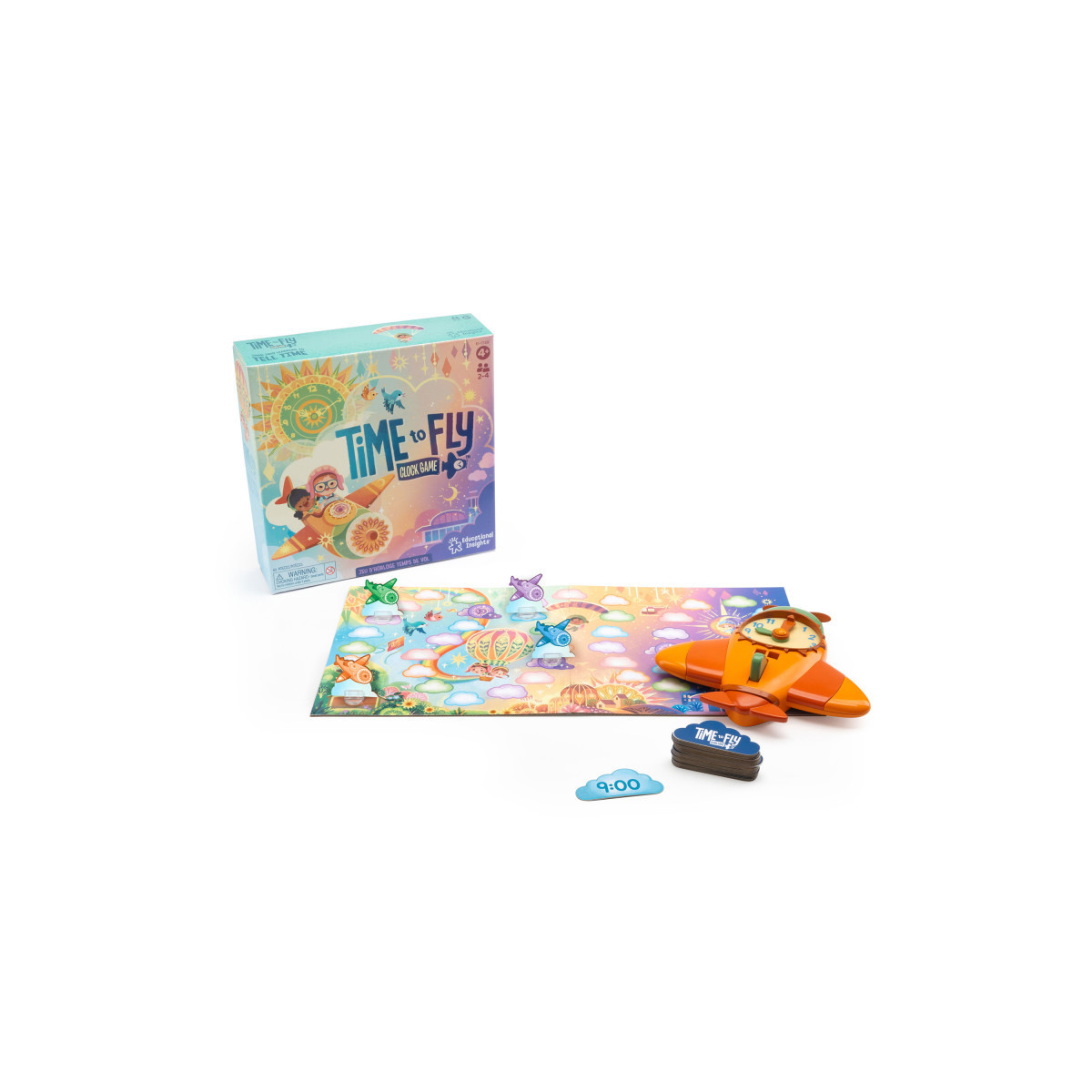 Soar across the gameboard by correctly telling time! Pick a card, set the clock, and take off if you're right. First player to land at the finish line wins! Includes one plane game clock, one game board, 30 time cards, four player pieces, and guide.