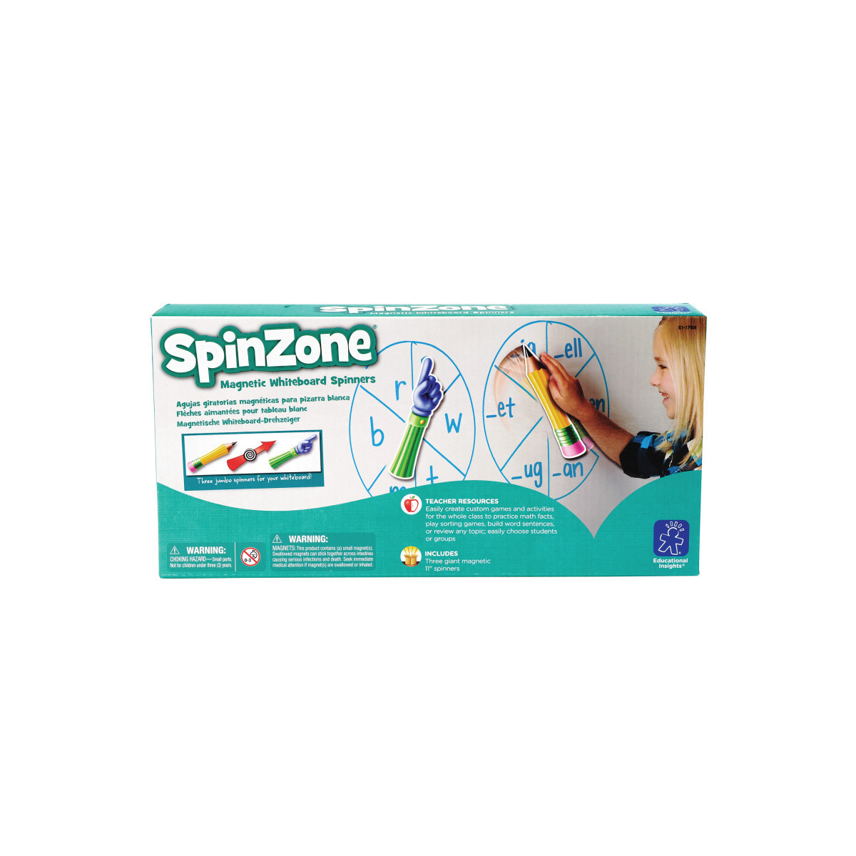 Add a fun spin to your classroom activities! Use these three giant 11" spinners to turn your whiteboard into a custom game or activity for the whole class. Draw a circle, write in content, attach a spinner, and play! Patent pending.