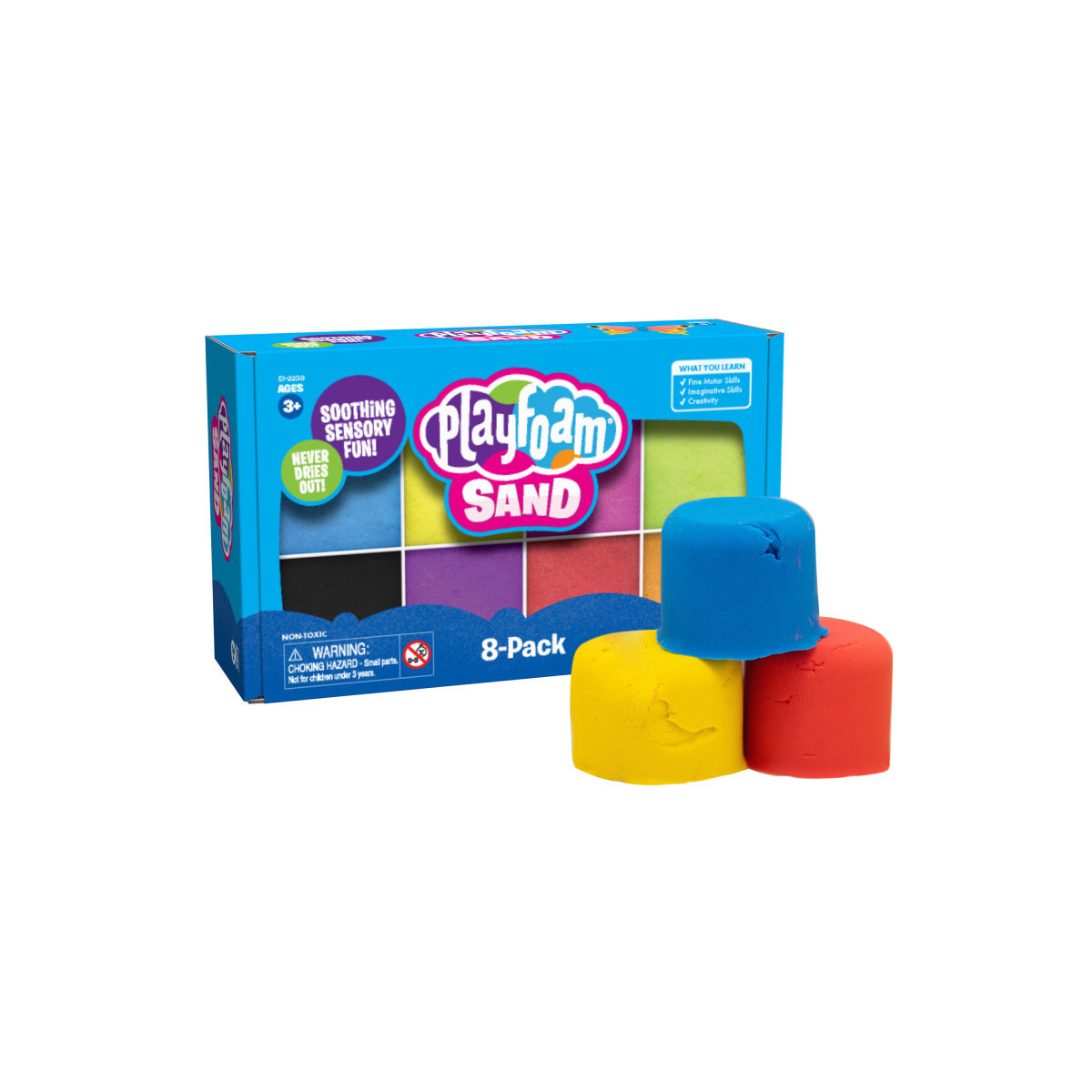 Sink into soft, sensory sand and feel the fine motor fun! This colorful set of Playfoam Sand is perfect for tactile preschool play. Seriously sculptable and magically moldable, kids can squeeze, shape, smash and sift using their hands and fingers, building the fine motor skills they need to learn how to hold a pencil or tie their shoes. Plus, extra-soothing Playfoam Sand is great for calming, creative play and the fun never ends because Playfoam Sand never dries out. Includes eight 6-oz packs of kid-safe, non-toxic Playfoam Sand.