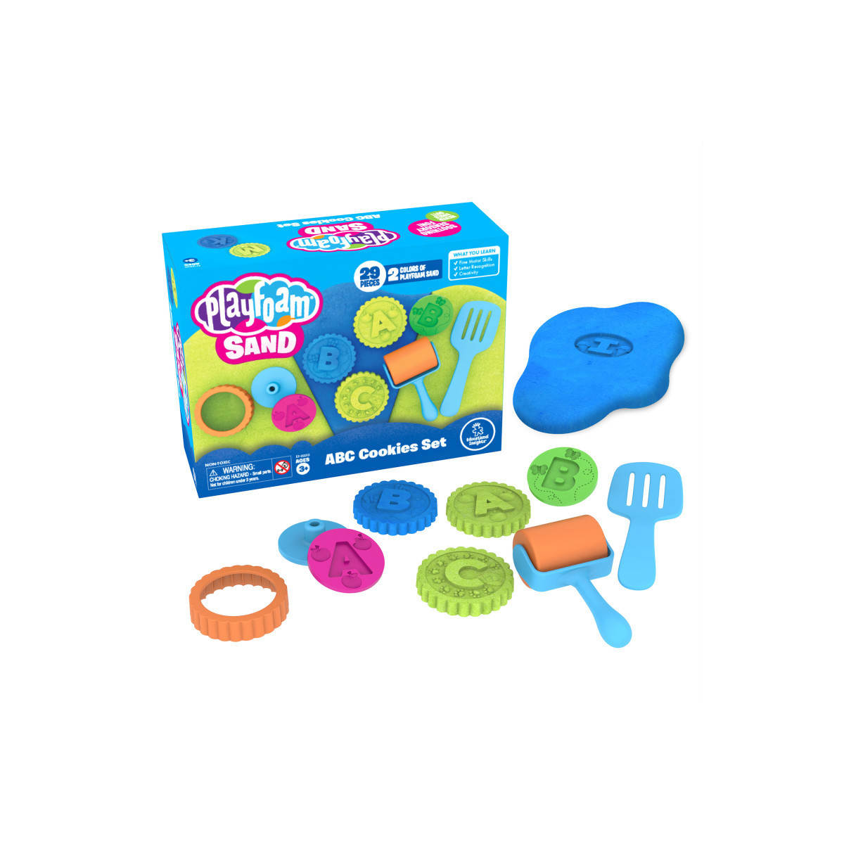 - INCLUDES: Two colors of soft, moldable Playfoam Sand, cookie cutter, handy roller, spatula, and 26 letter stamps, each with an image of an object that begins with that letter sound