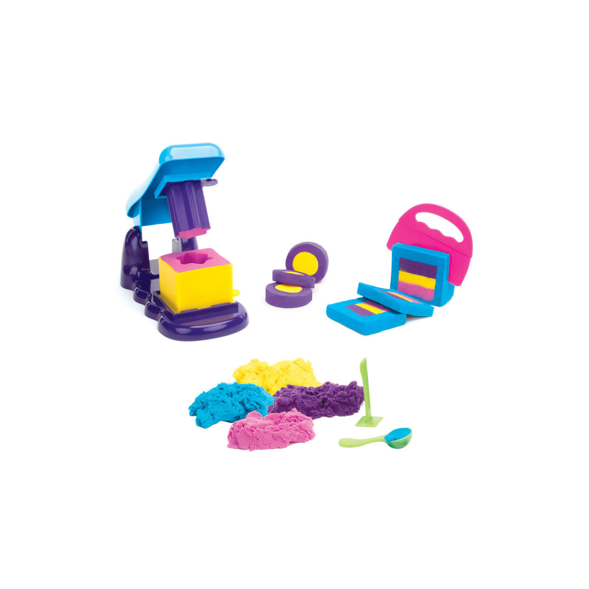 - INCLUDES: Three pounds of Playfoam Sand in four colors, a design station, cylinder and cube molds, three core molds, three shaped stampers, a cutter, and a scooper